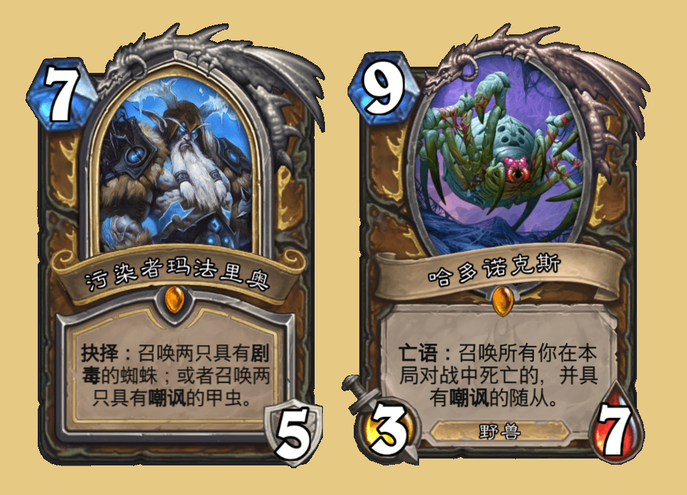 德鲁伊的DK优点可以说是非常的万金油,战吼效果和技能都很灵活,所以当时不少德鲁伊卡组都会带上他,但后来在女巫森林版本,有一套卡组却不得不放弃他,那就是墙德,原因也很简单,德鲁伊DK战吼效果无论选择哪个,召唤的都是野兽,而想要巫术时刻精准复活哈多诺克斯,是没办法带任何野兽的,所以只能忍痛放弃了DK。不过现在德鲁伊DK面对古夫,那真是弱爆了……