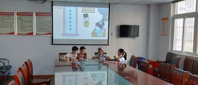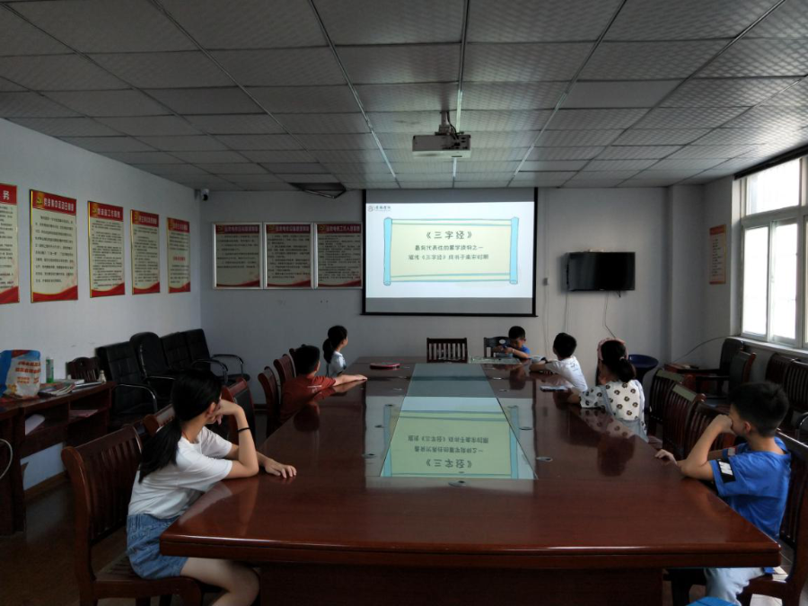 阅读结束后,孩子们在一起相互交流快乐的暑假生活,并观看国学经典《三字经》学习视频。