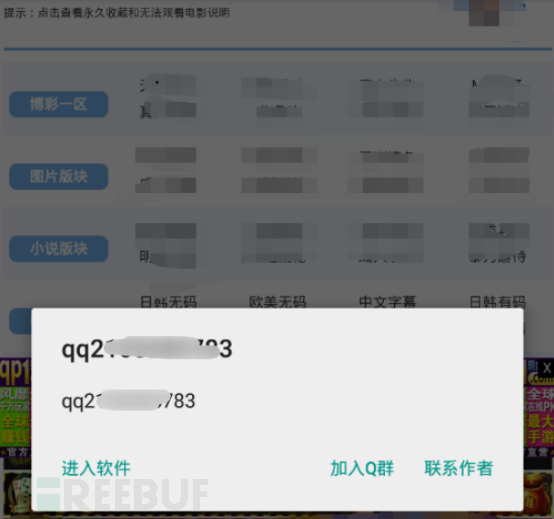 运行之后则会调用WebView打开上述的Av网站,有趣的是app会弹框提示联系作者或加入QQ群,且每个推广app内置的QQ号和QQ群都不一样。