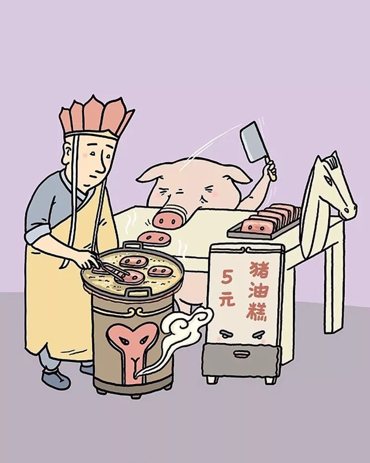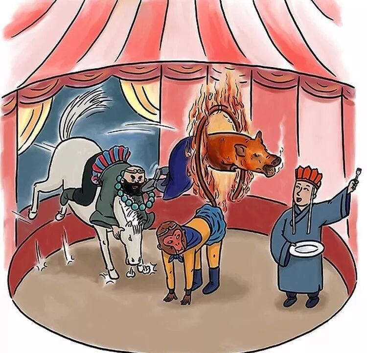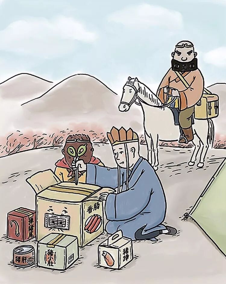 师傅,这是什么?这是香肠、猪蹄、猪尾巴啊。师傅,你有没有发现二师兄不见了?算了,我们先吃吧,不等他了。▼