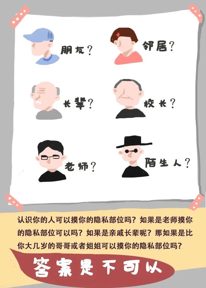 其他地方虽然我们不叫它隐私部位,但是只要别人碰了让你感觉不安全、奇怪、别扭、不舒服,都可以勇敢拒绝。