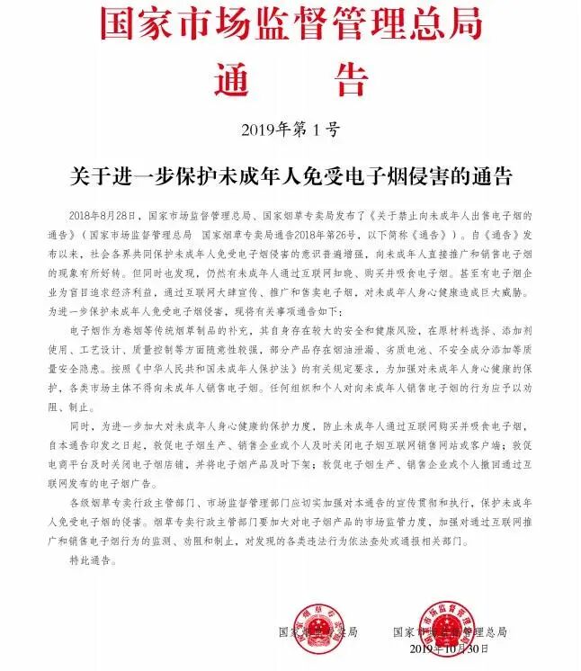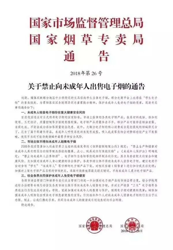 2018年8月28日,国家市场监督管理总局、国家烟草专卖局发布《关于禁止向未成年人出售电子烟的通告》: