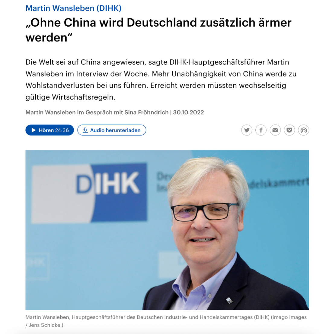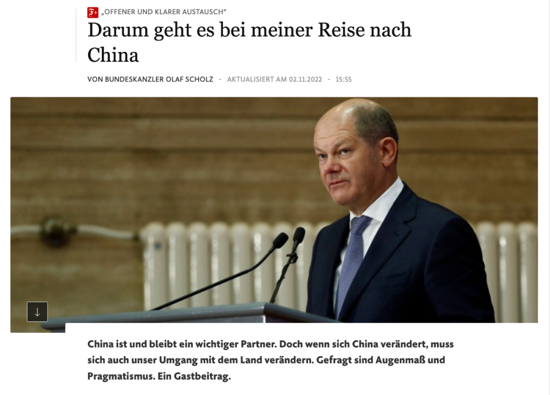 陈昌智 :11月4日,德国总理朔尔茨就任以来首次访华,这也是疫情以来欧洲国家领导人首次对中国进行正式访问。据你所知,德国主流媒体和企业,是怎么看待这次访问的。张智颖:德国时间11月2日,德国总理朔尔茨访华前,在《法兰克福汇报》发文,阐述了自己对于此次中国行的观点和态度。朔尔茨提到,过去三年,世界发生了翻天覆地的变化,但中国仍是德国和欧洲重要的经贸伙伴,德国不想也不能与中国脱钩。但是,德国必须消除单方面的依赖性,在关键性的依赖方面,例如重要的原材料、一些稀土或某些未来技术,德国企业必须通过寻找新的合作伙伴关系扩大他们的供应链。同时朔尔茨强调,如果中国的政策和立场变了,德国对待中国的方式也必须发生变化,需要注意分寸感和实用主义。
