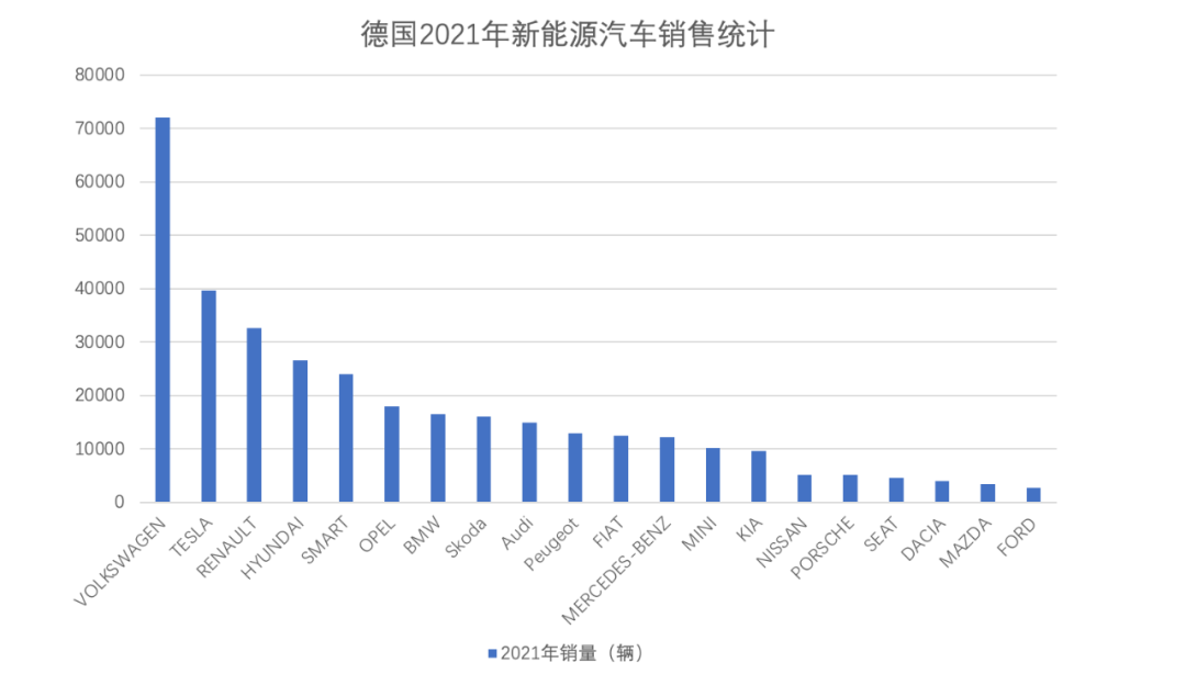 数据来源:公开资料整理从德国2021年新能源汽车的销售统计数据来看,大众集团依然稳居榜首,位居次席的是特斯拉。其中,大众集团的战略规划是德国BBA三大集团中最倾向于电动化的,2021年大众集团提出了NEW AUTO战略,并计划在沃尔夫斯堡工厂旁建立一个全新的电动工厂和研发中心。而今年3月,特斯拉在海外的第二座“超级工厂”(Giga Factory)——柏林工厂正式投产。随着柏林超级工厂的到位, 2022年特斯拉在德国,甚至欧洲的销量有望再次出现100%以上的增长。整体来看,目前德国新能源市场的主要玩家是传统车企和特斯拉,而本土新能源新势力发展情况一般。