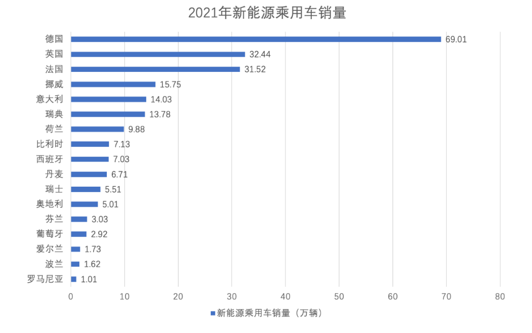 欧洲减碳目标和能源转型的大环境客观推动了德国新能源汽车的发展。根据市场调研机构 INSIDEEVs 的数据,2021年,德国是全球除了中国外最大的新能源汽车市场,以69.01万辆的销量位居欧洲第一 。同时,德国新能源汽车的新车渗透率为26.32%,是全球除北欧四国外最高的。