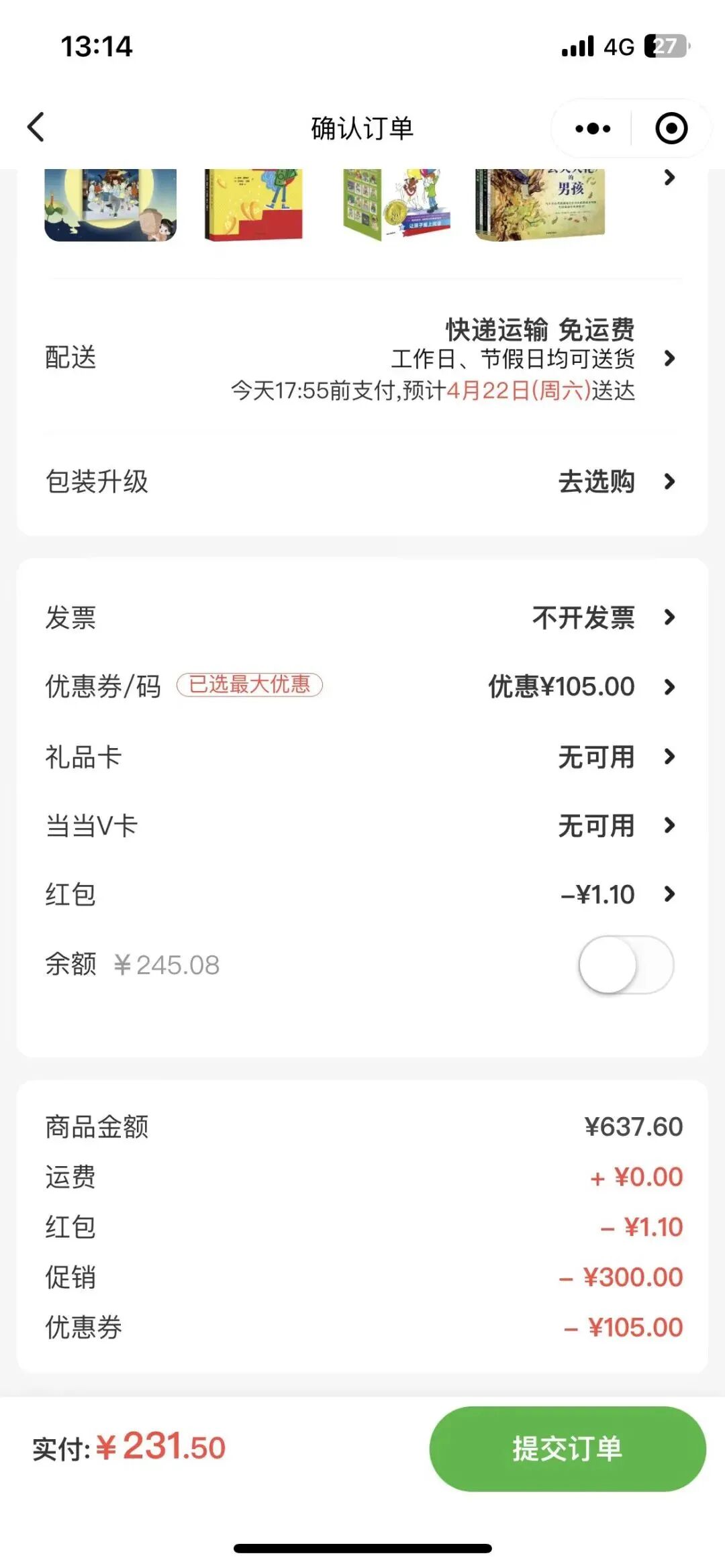 比如,依依妈刚刚下单的书,原价637.6,促销减300,优惠券减105,还有进入当当时抢到的红包,实付只有231.50