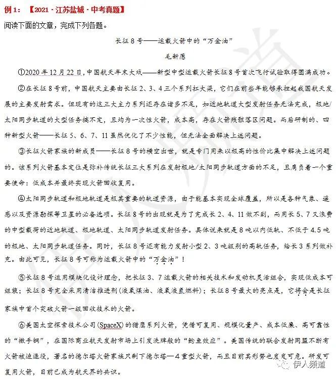 ⑦不过,火箭回收不是一朝一夕能够成功的,SpaceX也是在无数爆炸中才换来了成功。2020年末首飞的长征8号虽然是不可回收版本火箭,但该型号火箭将作为我国火箭回收技术的试验田,技术成熟后会不断应用在新型火箭上,未来有望赶超猎鹰系列火箭。总体上,终极版长征8号会是 、 、 的中型运载火箭,主要面向具有国际竞争力的商业卫星发射任务。(选自《百科知识》2021.02A,有删改)1.下列选项中对本文的理解分析错误的一项是( )A.第②③段主要运用作比较的说明方法,突出了长征8号火箭肩负的重要使命。B.长征8号把长3、7相关技术和发动机灵活组合,实现低成本可组装。C.猎鹰系列火箭出现后,美国传统的联合发射同盟不断有火箭被迫退役。D.文章按照逻辑顺序,先后说明长征8号设计理念、发展前景和主要特征。2.揣摩文章中加点的词语,回答下列问题。(1)第④段“万金油”在语段中是什么意思? (2)第⑤段“将会”一词能否删去?为什么? 3.阅读全文,在文中最后一句空白处补写“终极版长征8号火箭”的特点。 4.本文第⑥段介绍美国猎鹰系列火箭,有何作用? 【答案】1.D2.①“万金油”在文中指长征8号不仅能完成极地、太阳同步轨道任务,还有能力发射小型高轨任务,弥补了其他运载火箭的不足。②不能删。“将会”一词从时间上限制,说明长征8号未来可能是长征家族中首个突破火箭一级回收技术的火箭,但现在不是,若删去,说法过于绝对,与事实不符,体现了说明文语言的准确性。3.低成本 高可靠性 可回收复用4.列举美国猎鹰系列火箭的例子,具体生动地说明了研发可复用火箭已成为航天界的共识,从而说明我国终极版长征8号运载火箭前景广阔。【分析】1.本题考查对文章内容的理解与分析。注意题干要求找出错误的一项。D.有误,首先,根据第③段“系列火箭基本定位是弥补传统长征三大系列在发射极地/太阳同步轨道方面的不足,且肩负着一个重要使命:低成本并最终实现火箭回收复用”、第④段“同时,长征8号还有能力发射小型2、3吨级别的高轨任务,给长3系列做补充”可知,叙述的是长征8号的主要特征;其次,根据第⑤段“长征8号运用模块化设计理念……”可知,叙述的是长征8号的设计理念;最后,根据第⑦段“但该型号火箭将作为我国火箭回收技术的试验田,技术成熟后会不断应用在新型火箭上,未来有望赶超猎鹰系列火箭”“主要面向具有国际竞争力的商业卫星发射任务”可知,叙述的是长征8号的发展前景。所以选项中“先后说明长征8号设计理念、发展前景和主要特征”表述不正确;故选D。2.(1)本题考查理解词语在文中的含义。“万金油”常引申为形容人或物用处较多,在很多地方都能起到一定作用,这里用来形容长征8号,运用了比喻的修辞手法,把“长征8号”比作“万金油”,说明长征8号在很多地方都能有一定作用,并根据文章第④段“长征8号的出现就是为了完成长2、4、11做不到,而用长5、7又浪费的中型载荷的近地轨道、极地轨道、太阳同步轨道发射任务。具体说来就是8吨以内低轨、不低于4.5吨的极地(太阳同步轨道任务)。同时,长征8号还有能力发射小型2、3吨级别的高轨任务,给长3系列做补充”可概括其作用:能完成近地轨道、极地轨道、太阳同步轨道发射任务;有能力发射小型2、3吨级别的高轨任务;还能给长3系列做补充。(2)本题考查词语的表达效果。“将会”的意思是将来会,表示事物还没有出现或实现,在时间上有一定限制,说明长征8号未来可能是长征家族中首个突破火箭一级回收技术的火箭,但目前还不是,如果去掉“将会”,句子就变成了“长征8号是长征家族中首个突破火箭一级回收技术的火箭”,与事实不符,所以不能删。这个词体现了说明文语言的准确性。3.本题考查筛选整合信息。根据文中最后一句空白处前面“终极版长征8号”及后一句“主要面向具有国际竞争力的商业卫星发射任务”可知,空白处主要补写的是长征8号的优点长处。需要联系全文分析。根据第②段“在长征8号前,中国航天主要由长征2、3、4三个系列扛大梁……这三大主力系列还存在诸多不足,如近地轨道大型发射任务无法完成,极地同步轨道的大型任务搞不定,且均为一次性火箭,成本高,存在火箭残骸落区问题”、第③段“长征8号的横空出世,就是专门用来以极高的性价比集中解决上述问题的”可知,长征8号与三大主力系列相比,具有低成本,高可靠性的优点。根据“且肩负着一个重要使命:低成本并最终实现火箭回收复用”可知,长征8号除了具有低成本,高可靠性的优点,还有可回收复用的优点。所以空白处可补写:低成本、高可靠性、可回收复用。4.本题考查重点段落的作用。根据第⑥段“研发可复用火箭,目前已成为航天界的共识”可知,第⑥段介绍美国猎鹰系列火箭是作者为说明研发可复用火箭已成为航天界的共识这一问题而举出的实例,运用了举例子的说明方法,根据第⑦段“2020年末首飞的长征8号虽然是不可回收版本火箭,但该型号火箭将作为我国火箭回收技术的试验田,技术成熟后会不断应用在新型火箭上,未来有望赶超猎鹰系列火箭”可知,我国终极版长征8号运载火箭的发展目标也是一样,从而说明长征8号运载火箭前景广阔。 例2:【2021·贵州遵义·中考真题】阅读短文,回答问题 “芯芯”之火,可以燎原胡伟武①说到芯片,就不得不提芯片领城