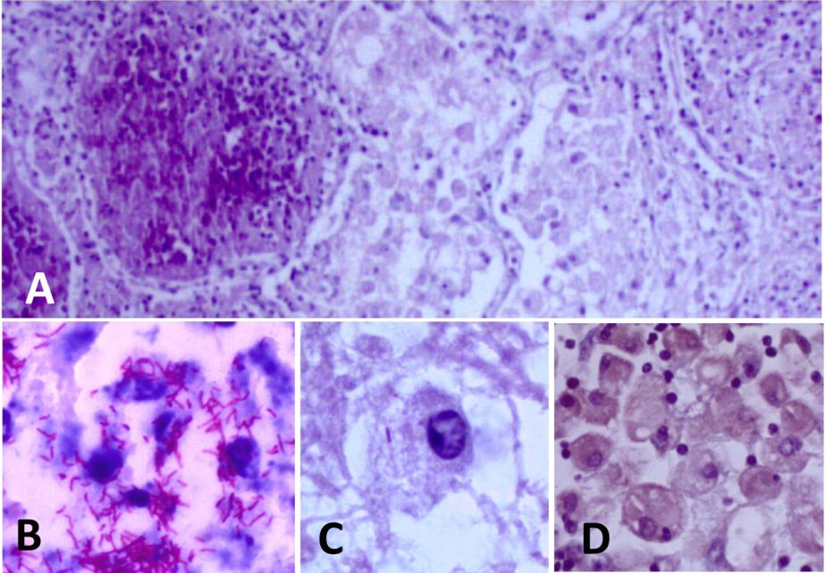 图4. AFB和分枝杆菌抗原在继发性结核病的分布。在发生继发性肺结核后泡沫肺泡巨噬细胞中很少发现AFB。随着坏死的发展,它们的数量显著增加。(A)肺切片,肺泡内可见AFB团块,伴干酪样坏死,但相邻肺泡未见AFB团块(抗酸性染色40X)。(B)AFB与坏死细胞和碎片的高倍放大(抗酸染色400X)。(C)活巨噬细胞中单个AFB(抗酸染色400X)。(D)在无AFB的活细胞中发现大量分枝杆菌抗原(免疫组化染色MTB 400×)。