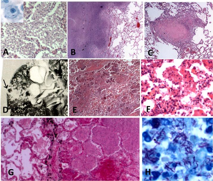 图8.免疫抑制人群的结核。病例1。(A-C)与HIV有关的结核。肺多个区域显示结核性肺炎,肺泡中含有巨噬细胞,有许多AFB(小图),但脂质很少(A)。肺泡壁含有大量的淋巴细胞。大面积的结核性肺炎最近发生了坏死(B)。肺的其他区域也显示出粟粒性肺结核的干酪样肉芽肿(C) (H & E染色100-400倍放大,抗酸染色1000倍放大)。