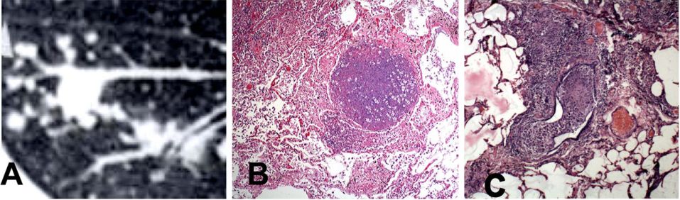 图3.继发性肺结核的支气管闭塞。树芽型是早期原发性肺结核的典型CT表现(A)。X光片上的树枝是充满受感染细胞和碎片的支气管,而芽是肺泡中结核性肺炎的区域。切片(B, C)显示支气管被这种碎片阻塞。支气管阻塞已被许多作者报告在100%的继发性肺结核病例中(H & E染色100×放大倍数)。