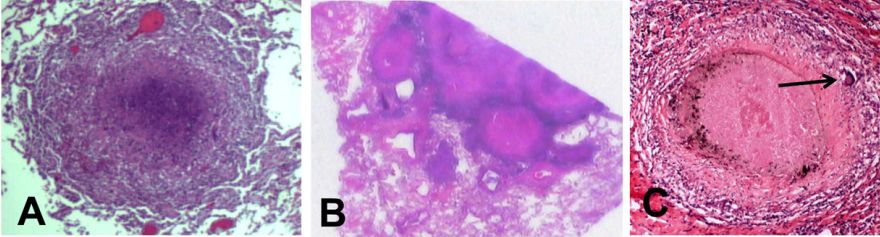 图1. 富含脂质物质的坏死中央核周围有泡沫状巨噬细胞、上皮样巨噬细胞和淋巴细胞。图示3例干酪样肉芽肿:(A)显示粟粒性肺结核患者肺部早期干酪样肉芽肿(H & E染色100×)。(B)一簇干酪样肉芽肿,被误认为是癌症,经手术切除。干酪样坏死物周围的蓝色染色淋巴细胞层特别明显(H & E染色1×)。(C)人肺较老的病变,可见纤维包膜和坏死中心。上皮样细胞和巨细胞(箭头)表明它仍然是活跃的(H & E染色100×)。