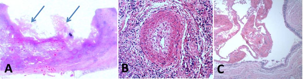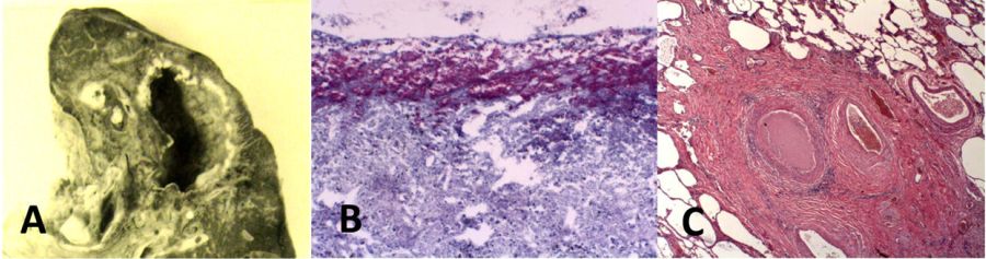 图5.空洞形成。典型的结核性空腔在急性发热性肺炎发作后迅速形成。(A)含有坏死的肺组织的发育中的腔。腔壁由一层覆盖在脂质性肺炎上的坏死层构成。腔内有坏死的肺碎片(箭头)(H & E染色4倍放大)。经PCR和AFB检测,尽管该肺的微生物数量较少,但对MTB呈阳性反应。(B)肺小动脉血管炎。血管壁增厚,空泡化,淋巴细胞浸润。腔内大部分被阻塞(H & E染色100倍放大)。(C)急性空洞型肺结核患者支气管内坏死的肺组织(H & E染色40倍放大)。
