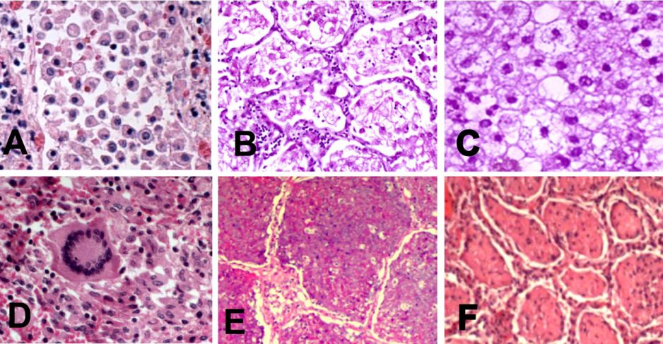 图2.继发性肺结核发展的组织病理学。(A)最初肺泡内充满巨噬细胞,而肺泡壁淋巴细胞数量增加。巨噬细胞由于脂质堆积而呈泡沫状。这种病变可能以多种方式发展。在某些区域(B),以细胞碎片和纤维蛋白为主。在另一些(C)中,巨噬细胞变得越来越富脂。可以发现朗格罕斯巨细胞(D)。最后,肺泡内的许多细胞发生干酪样坏死(E),这一过程可能涉及肺的较大区域或单个肺泡。大多数这样的病变可以用纤维蛋白和纤维组织替代肺泡细胞而自行消退(F)。病变最终在肺尖处形成纤维性瘢痕(100 ~ 400倍放大h&e染色)。