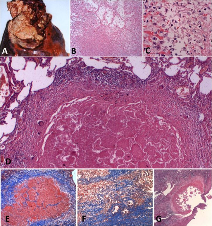 图7.慢性纤维干酪性结核病。大量干酪样肺炎不能软化和碎片化而产生空洞,可能只是停留在相对不活跃的状态。在本例中,肺上叶坏死伴干酪样肺炎,已干尸化(A)。显微镜下,它由干酪样肺炎构成,邻近富含脂质结核性肺炎(B,C)的生存区(H & E染色100-400倍放大)。老年干酪样肺炎常被肉芽肿组织包围(D)。中央坏死核心保留干酪样肺炎的肺泡结构,周围是活跃的肉芽肿,有上皮样细胞、巨细胞和淋巴细胞,但没有泡沫状巨噬细胞。纤维化围绕着干酪样肺炎的小区域(E),或扩展到肺的大区域并伴有较大的病变,从而产生肺纤维化(F)。多层纤维化显示病变在不同的情况下进展和消退(G)。(三色染色40倍放大)。很少见到干酪样肉芽肿侵蚀入空洞(G)。然而,病变往往很小,很难清楚空洞是否侵蚀成肉芽肿或反之亦然。