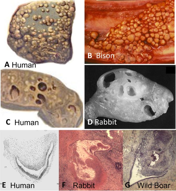 牛分枝杆菌在人(E)兔(F)和野猪(G)体内引起的蛀牙具有相似的特征。干酪样肉芽肿已侵蚀入支气管。兔和野猪病变图像显示中央软化和液化。唯一可用的人类病变图像显示相似的形态。(H & E染色40倍放大)。