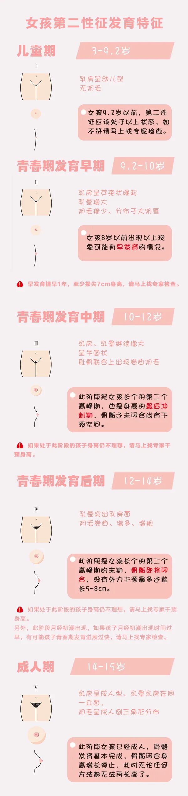 此时介入已是晚干预,唯一的治疗方案是:1、用药物抑制性腺发育;2、联用重组人生长激素治疗,提高孩子生长速度。两种药物同时作用,孩子受的苦、家长付出的代价远远大于早干预。如果早干预,情况会完全不同:发育前期通过3~5年治疗,让孩子的身高和生长激素达到和同龄人一样的水平,之后再比较观察,如果青春期能达到正常发育水平,家长后面就不用担心了。因此,对于这部分的孩子家长应该遵循早发现、早诊断、早干预的原则,不可盲目等待,错过身高最佳干预时机。4、为什么父母都是正常身高,但孩子却偏矮?出现这样的情况有很多因素,比如遗传。如果父母身高正常、但一方基因中带有隐形遗传的疾病,那他生下的后代会有1/4的几率发病,这就会造成孩子身高偏矮。还有一种情况是早发育。尤其父母一方身高正常、另一方偏矮,娃前期身高一直处于p3~p5的水平,这样的孩子一定要注意,一旦出现早发育,那这无疑是雪上加霜,因为整个青春期也就长个20公分(女孩),基础不够,终身高就不会很理想。男孩第二性征发育特征↓