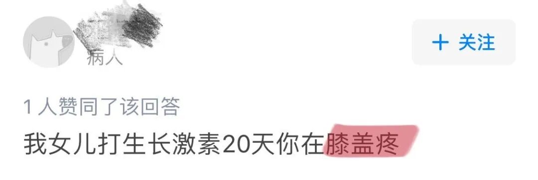 但并不是所有人注射了生长激素都能达到这么理想的效果,有些孩子,用完药只长了3cm↓男孩小五,15岁,爸爸身高180cm,妈妈身高165cm,然而15岁的小五只有160cm。骨龄片显示,小五现在的骨骺线已经呈现半闭合状态,即便使用生长激素治疗身高增长最多也不会超过5cm。父母想做最后的努力:“试试吧医生,能长高多少是多少,总比一点不张要好吧!”就这样,小五用药半年后,身高只长高了3cm,上个月拍骨龄片显示骨垢线已经完全闭合,终身高定格在163cm。效果因人而异还不是关键,家长们最最担心的是,个子高了,却要用其他不良反应来换↓面对正反两种完全不同的声音,家长该如何科学认识生长激素、做出适合自家娃的判断呢?下面这部分王春林主任的独家专访,或许会帮到你。