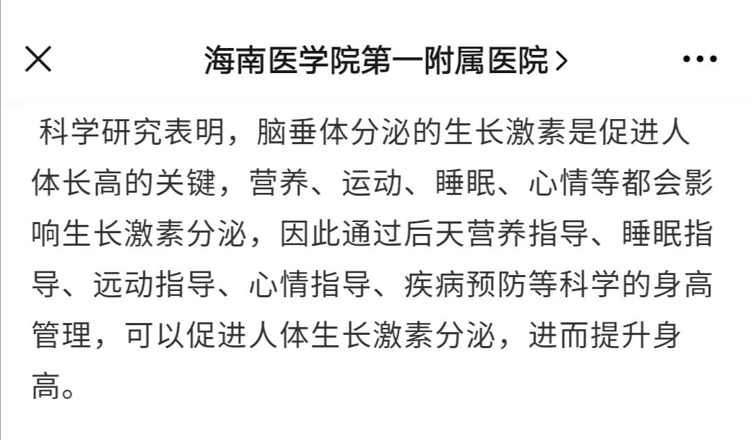 牛妈心语闺蜜上周刚带孩子去做身体检查时偶然发现了这个问题,医生建议打生长激素,很多父母第一次听说肯定是吓一跳。吃饭时,我和老潘说我想再科普一下,结果我家奶奶也没听清我说什么,只是听到了要打生长激素让孩子长高就脸色都变了,说这怎么行啊,孩子能长就能长,都是遗传的,打这个有什么用呢?我望着她老人家愣是不知道怎么说才好,结果她很认真地补充了一句说,真的!所以我想提醒大家,如果孩子有必要接受治疗,那还是别告诉老人家了。闺蜜家孩子身高一直偏矮小,但主要考虑是发育迟吧,结果这次偶然通过脑部CT发现脑垂体的发育偏不良,脑垂体的发育和身高有直接关系,看了两个大医院的建议都是打生长激素。否则后期会影响孩子最终身高。闺蜜第一反应也是选长程一点,比较没那么麻烦,但医院还是建议选短程,没必要为了长程而选长的,毕竟价格真的不便宜最终选择的价格大约是每个月五千费用,持续一年。下面是海南医学院第一附属医院一篇文章的截图:
