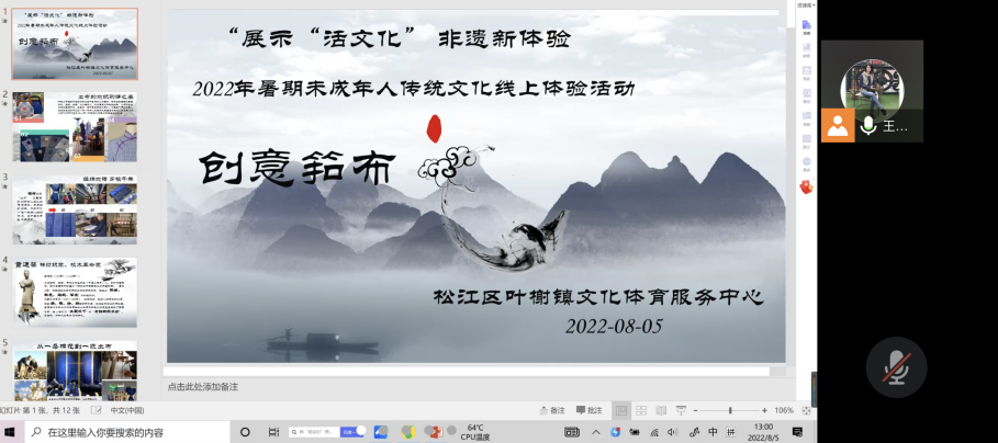 为加深同学们对优秀的中国传统文化的了解,让大家感受非遗魅力,8月5日组织世源和世强辖区30多位少年儿童开展“展示‘活文化’非遗新体验”线上手工制作活动,让孩子们体验传统文化的魅力与亲自动手制作的乐趣。