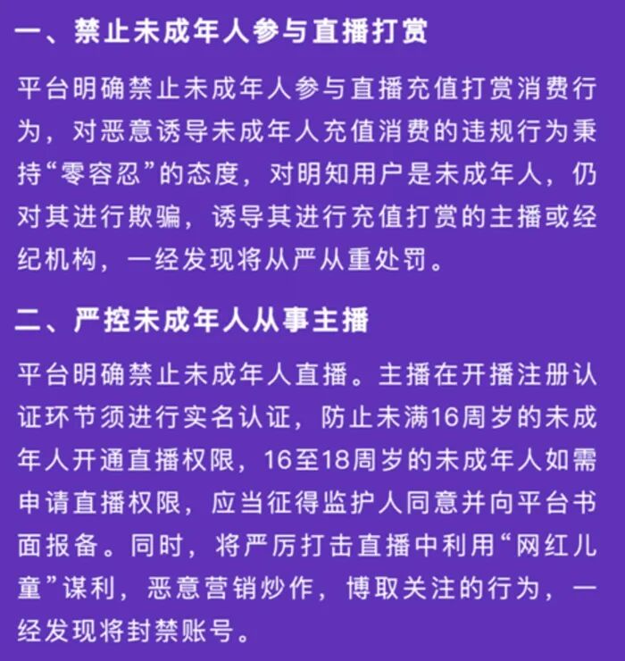 快手6月1日表示,平台明确禁止未成年人参与直播充值打赏消费行为,对恶意诱导未成年人充值消费的违规行为秉持“零容忍”的态度,对明知用户是未成年人,仍对其进行欺骗,诱导其进行充值打赏的主播或经纪机构,一经发现将从严从重处罚。 腾讯日前也表示,在微信视频号“青少年模式”下,青少年将无法使用直播打赏等功能。 禁止利用“网红儿童”牟利 不仅仅是禁止直播打赏,未成年人从事主播也严控。 快手表示,主播在开播注册认证环节须进行实名认证,防止未满16周岁的未成年人开通直播权限,16至18周岁的未成年人如需申请直播权限,应当征得监护人同意并向平台书面报备。 “快手将严厉打击直播中利用‘网红儿童’谋利,恶意营销炒作,博取关注的行为,一经发现将封禁账号。”