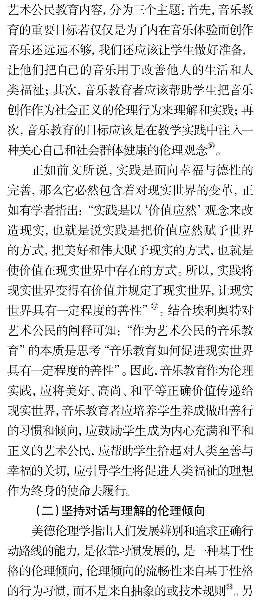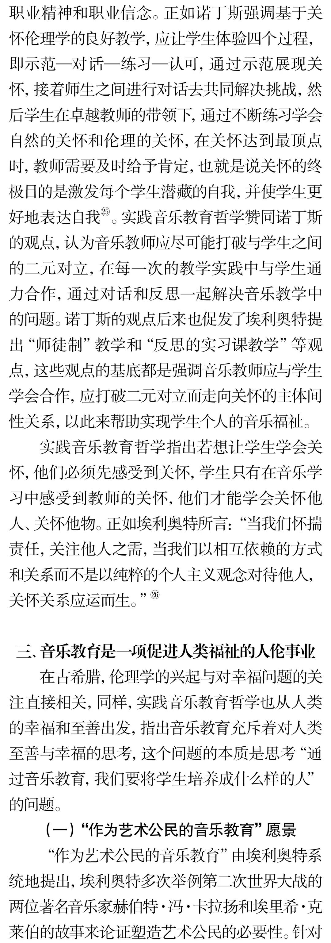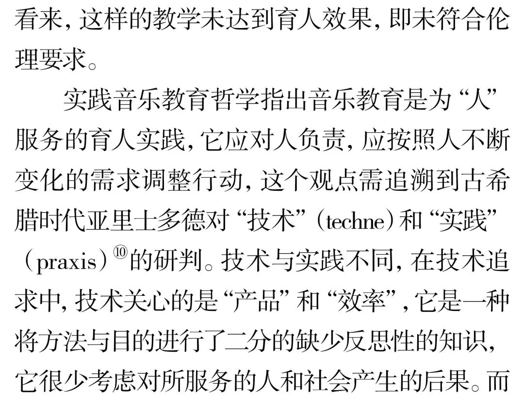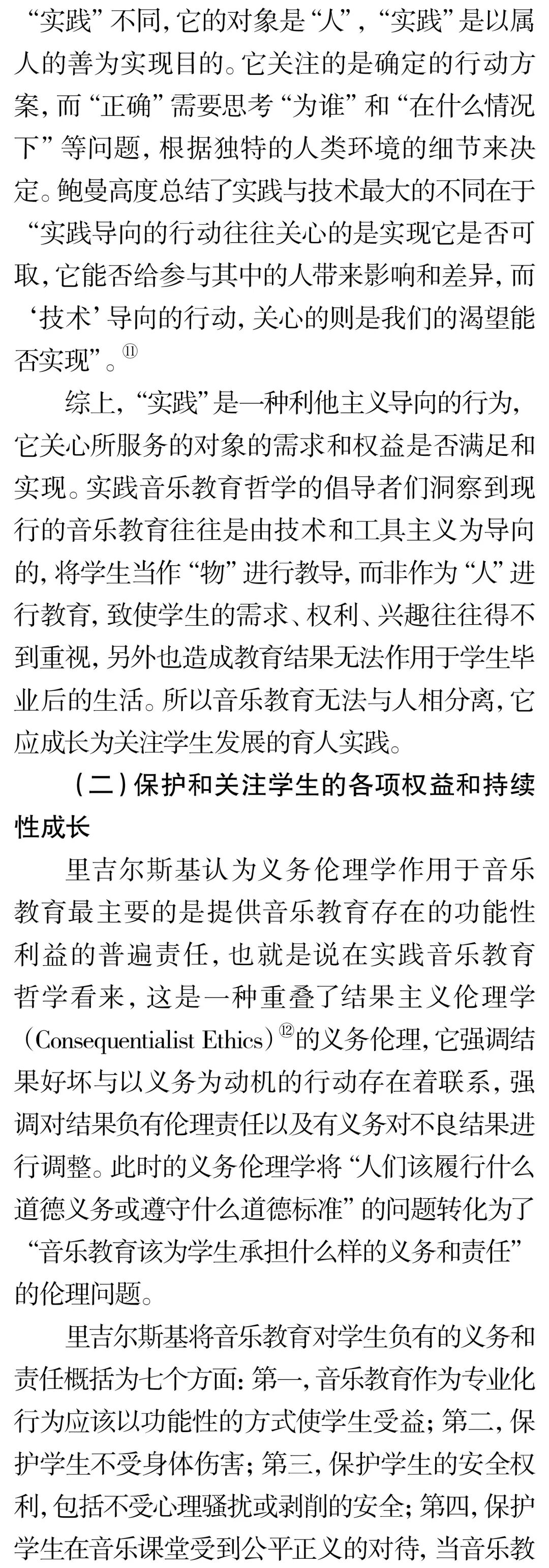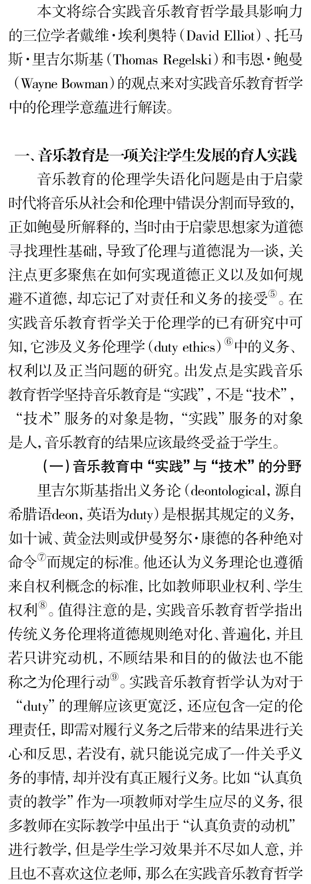 摘 要:实践音乐教育哲学批判与反思了音乐教育与社会、文化、政治、伦理相分离的做法,并倡导复归音乐教育伦理学。实践音乐教育哲学关于伦理学意蕴的研究主要聚焦于三个方面的洞察:首先音乐教育是“实践”,并非技术,它的服务对象是“人”,不是“产品”,因此有义务和责任关注学生的权益和持续性成长;其次音乐教育作为助人型职业,与医疗实践、法律援助一样,不仅需做好分内工作,同时还要对它所服务的对象持有关怀和保证他们不受伤害;最后音乐教育与人类社会的发展息息相关,音乐教育的终极目的应是促进人类福祉的实现。关键词:伦理学;伦理;实践;实践音乐教育哲学;音乐教育中图分类号:J60-059 文献标识码:A文章编号:1002-9923(2022)03-0162-08DOI:10.13812/j.cnki.cn11-1379/j.2022.03.020作者简介:储冀璇(1996— ),女,汉族,安徽师范大学教育科学学院博士。