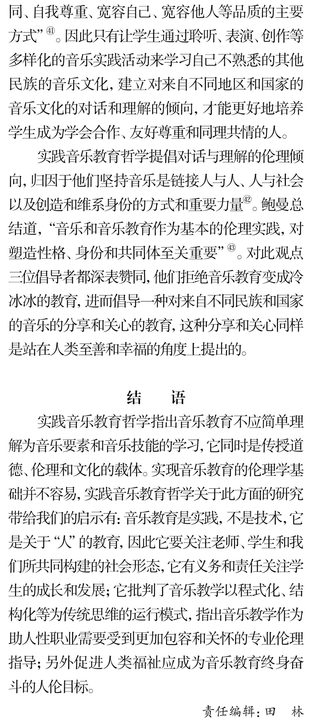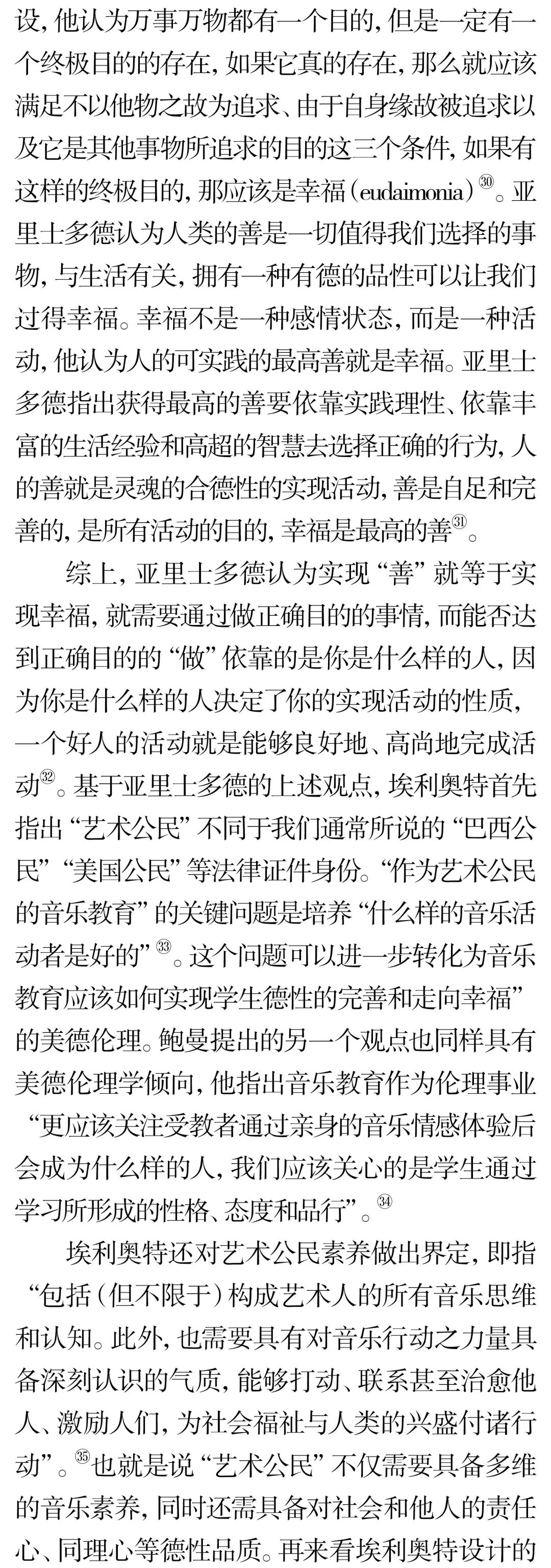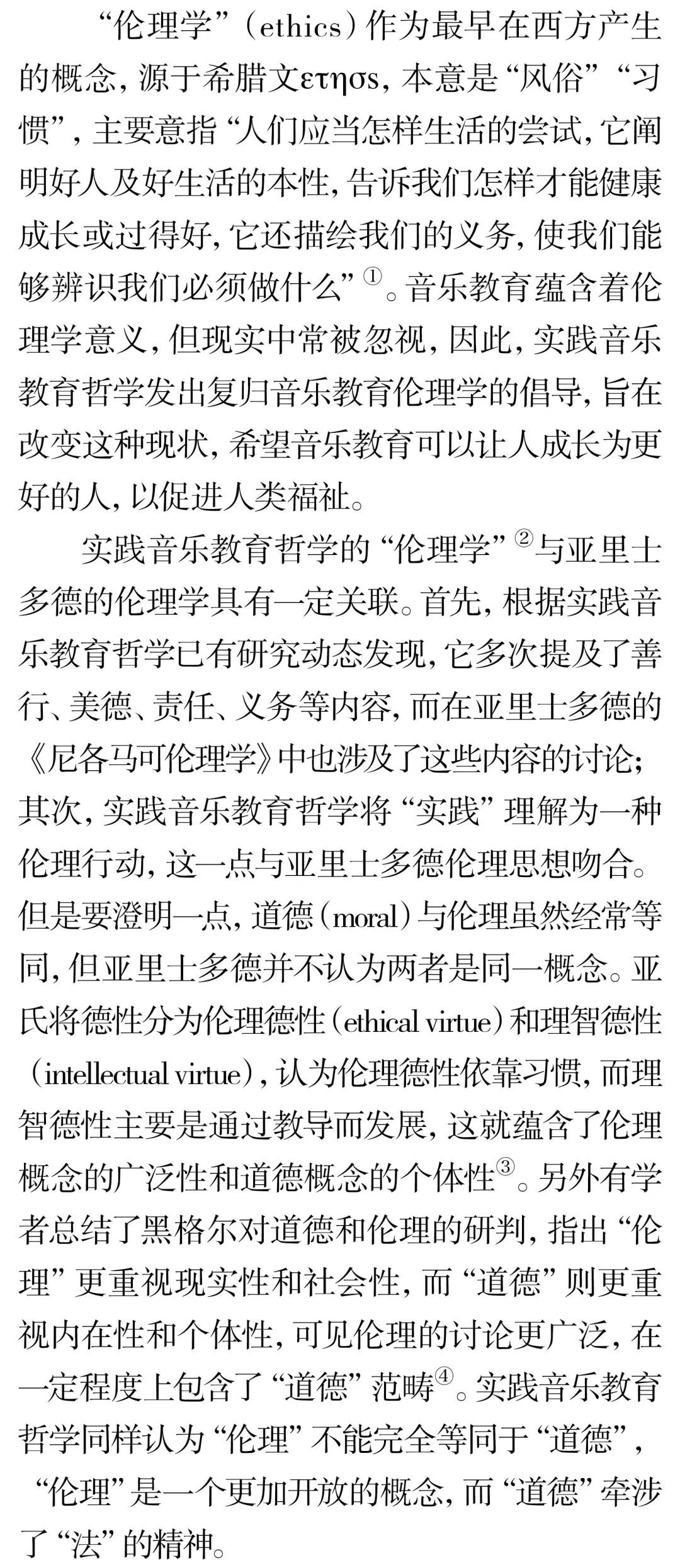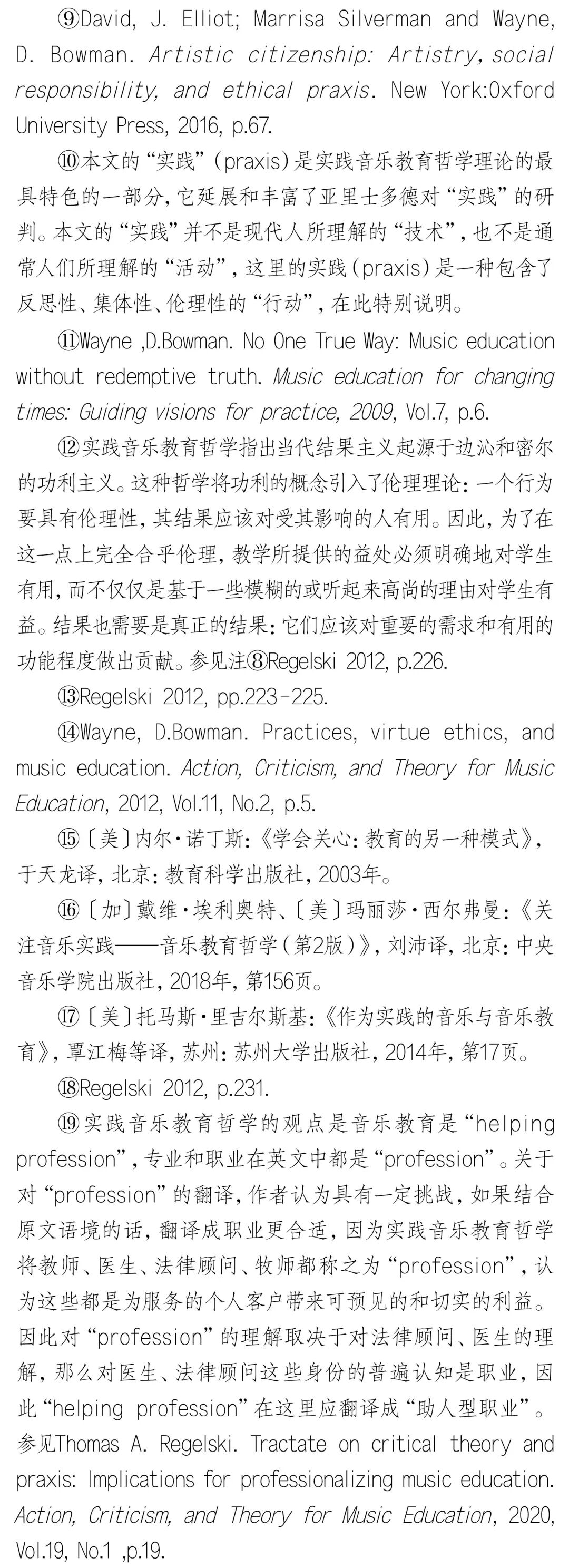 摘 要:实践音乐教育哲学批判与反思了音乐教育与社会、文化、政治、伦理相分离的做法,并倡导复归音乐教育伦理学。实践音乐教育哲学关于伦理学意蕴的研究主要聚焦于三个方面的洞察:首先音乐教育是“实践”,并非技术,它的服务对象是“人”,不是“产品”,因此有义务和责任关注学生的权益和持续性成长;其次音乐教育作为助人型职业,与医疗实践、法律援助一样,不仅需做好分内工作,同时还要对它所服务的对象持有关怀和保证他们不受伤害;最后音乐教育与人类社会的发展息息相关,音乐教育的终极目的应是促进人类福祉的实现。关键词:伦理学;伦理;实践;实践音乐教育哲学;音乐教育中图分类号:J60-059 文献标识码:A文章编号:1002-9923(2022)03-0162-08DOI:10.13812/j.cnki.cn11-1379/j.2022.03.020作者简介:储冀璇(1996— ),女,汉族,安徽师范大学教育科学学院博士。