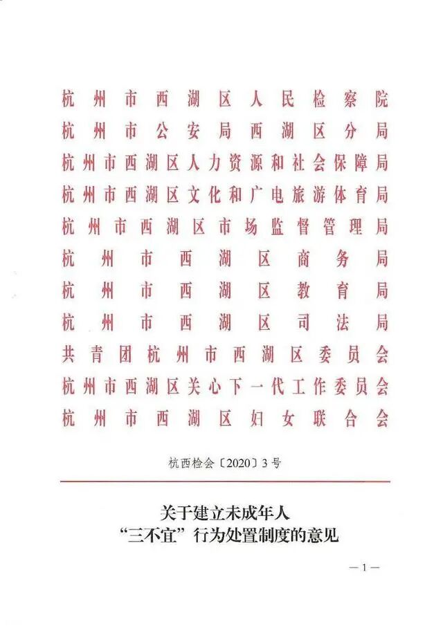 5月25日,西湖区检察院联合区公安分局、人社局、文化广电旅游局、市场监管局、商务局等10个部门联合会签《关于建立未成年人“三不宜”行为处置制度的意见》。