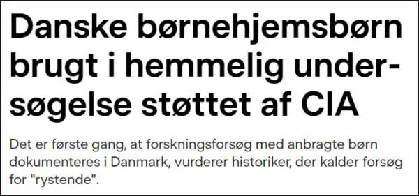 据丹麦广播公司报道,近日播出的一部名叫《寻找自我》的丹麦纪录片,披露了美国中央情报局(CIA)涉嫌资助上世纪60年代对311名丹麦儿童进行的一场秘密人体实验。这些儿童大多是被人领养或来自孤儿院,始终未被告知实验的具体目的。