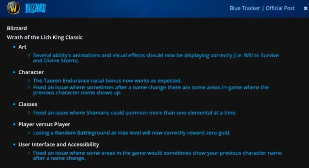 11月2日,暴雪发布了魔兽世界巫妖王之怒怀旧服最新热修说明蓝贴,其中除了部分BUG修复与画面优化之外,最重要的就是对游戏中的几个角色进行了强度调整。