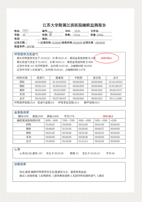 根据检测结果,吴先生被诊断为重度阻塞性睡眠呼吸暂停综合征,在排除了上气道解剖异常后,医生对其进行了双水平气道正压通气治疗。