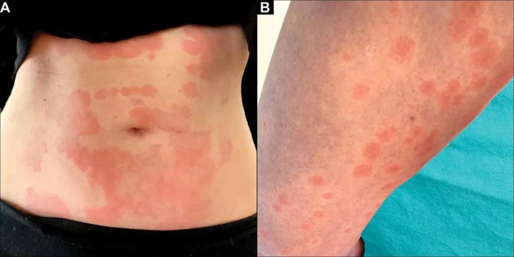 急性荨麻疹也是新冠阳性患者比较常见的皮肤病之一。一般表现为全身可出现的皮肤红斑、风团以及瘙痒,伴或不伴发热。