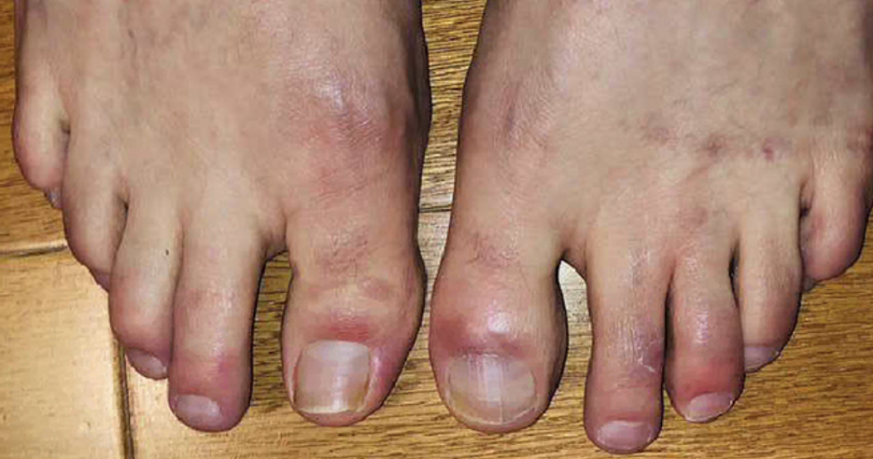 肢端表面冻疮样病变又称“COVID趾”,表现为手指、肘部、足趾及足外侧的紫红色或紫癜性斑疹,有时伴有水肿和瘙痒。