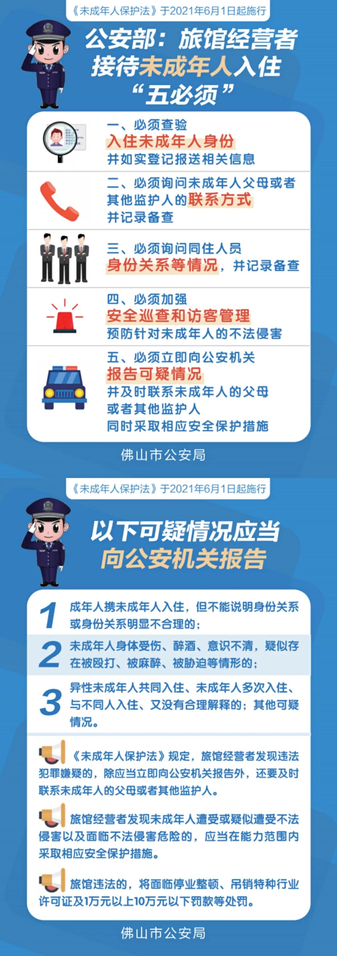 今年6月1日,新修订的《未成年人保护法》正式实施,新法第57条对旅馆、宾馆、酒店等住宿经营者接待未成年人入住的情形作了明确规定。公安部针对未成年人入住旅馆、酒店的问题,也提出了“五必须”的要求: