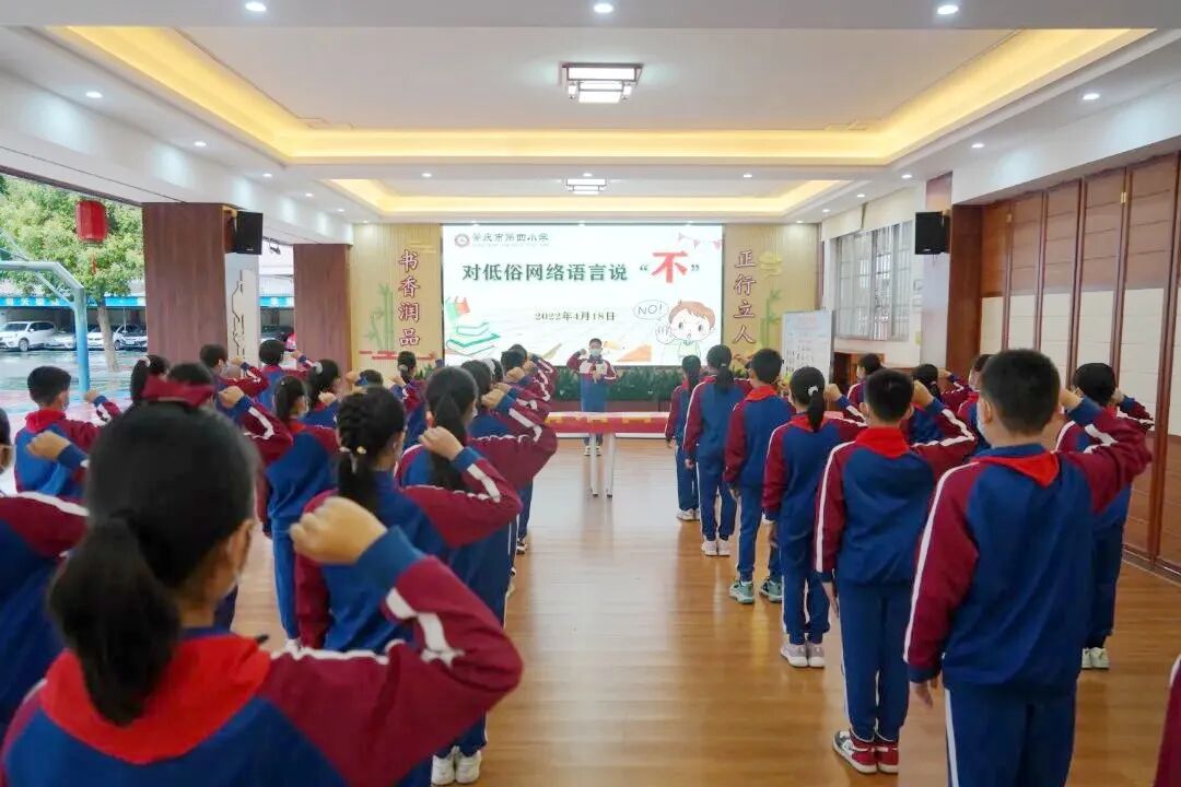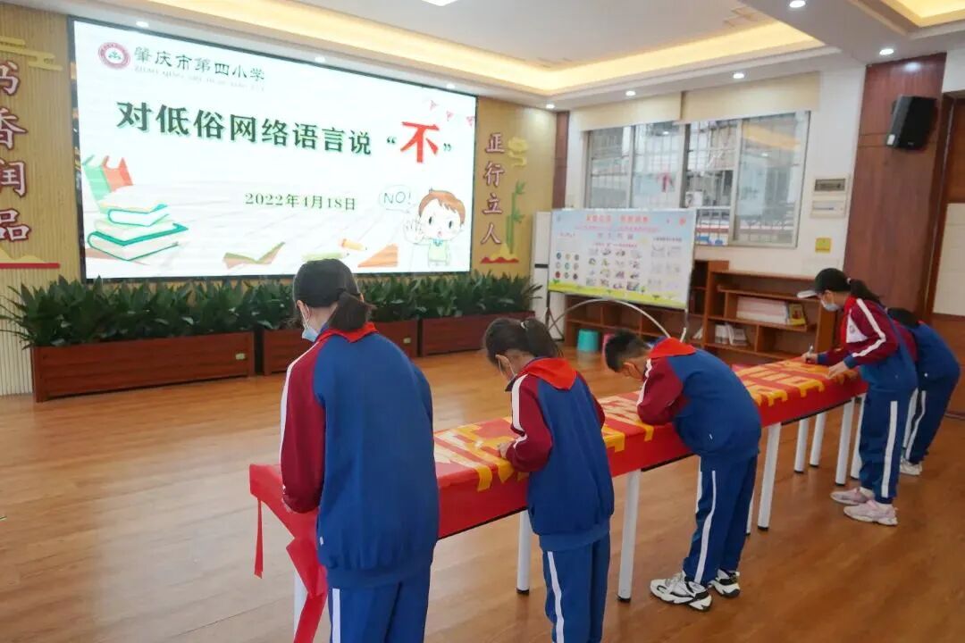 为引导师生、家长自觉文明上网,规范自身的网络行为,近日,肇庆市第四小学大队部组织开展了“对网络低俗语言说‘不’!”宣誓活动。活动上,学生代表向全校师生发出“文明上网,不说脏话,做谦恭有礼的新时代好少年”的倡议,各中队代表用坚定的声音宣誓:“自觉抵制网络不文明言行,做谦恭有礼的好少年!”并签名承诺。
