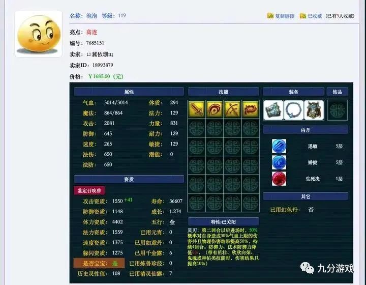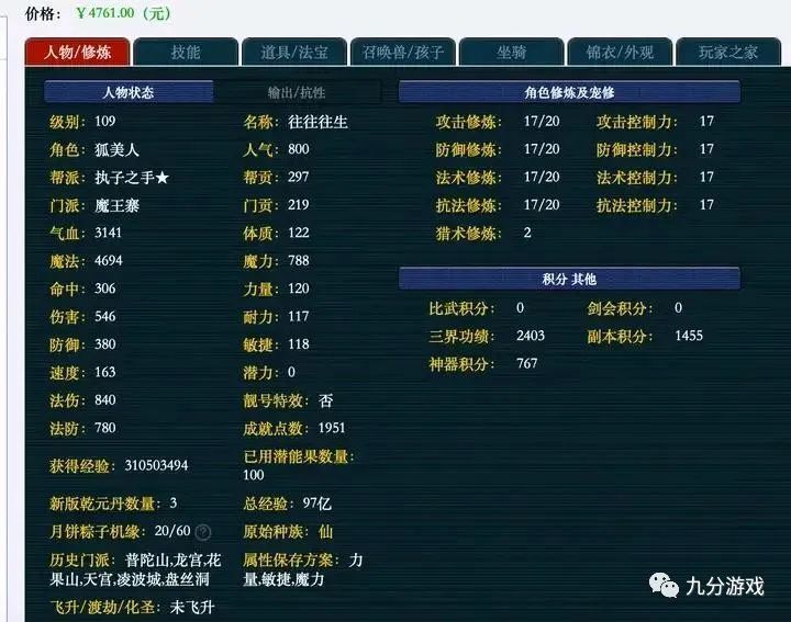 除机缘属性之外,基本是全满底子。携带有羽仙歌月白锦衣+五六款发型(原妹子号主很会搭配),满成长坐骑+2.2坐骑两只,法宝基本满,神器3个对的差1个,全力全魔全敏属性3套,差机缘,价格4760,总价20160。转服费60,9月解锁还有2个半月,全号2个80装备的槽点,个人能接受,力盘丝好像腰带位置加伤害,考虑换100腰带8段,差价在500内。