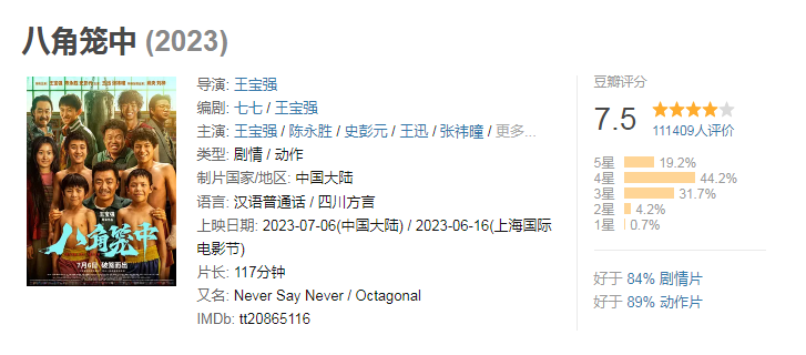 豆瓣得分7.5,超过44%的人给出了4星好评。