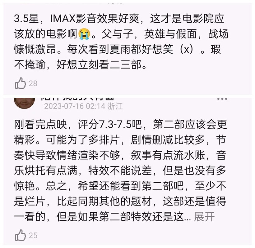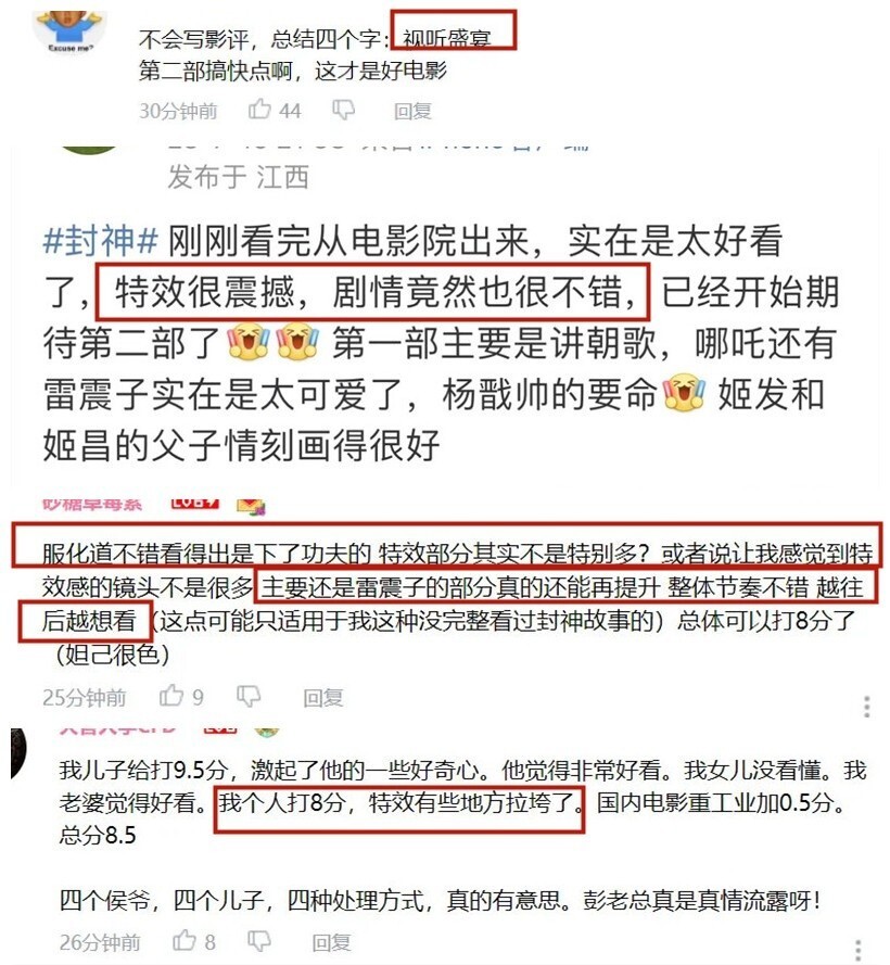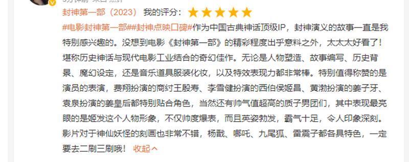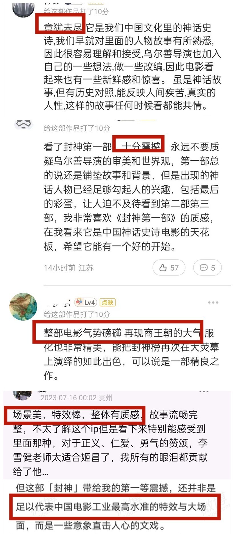 看过影片的观众中,不少用“史诗片”来定义《封神第一部》,认为电影从场景到特效,从叙事到节奏,完成度都非常高,感叹“十分震撼”、“意犹未尽”。