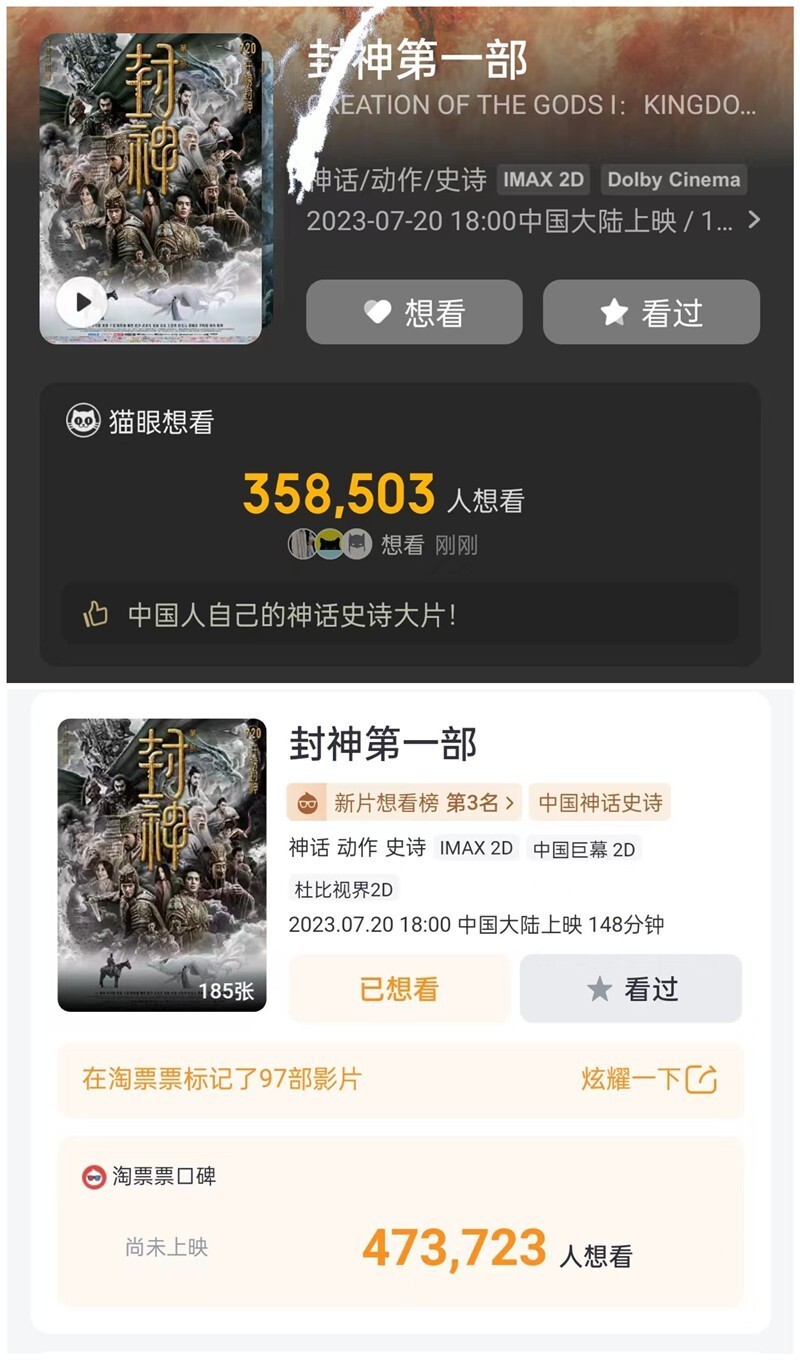 虽然选角和造型都存在争议,但《封神第一部》的想看人数,仍然高达80余万。