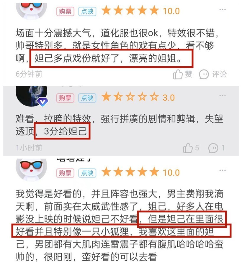 就连抱怨影片特效拉垮、剧情拼凑,继而怒打3分的观众,也不忘在评论中声明分数都是给妲己的。