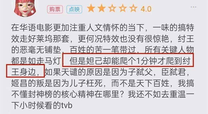 在这部分观众看来,故事不仅已经跟原著毫不相关,而且剧情狗血、漏洞密集,可谓是一团混乱。合格的电影是偶有不足,而《封神第一部》却是从漏洞中找剧情。