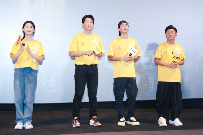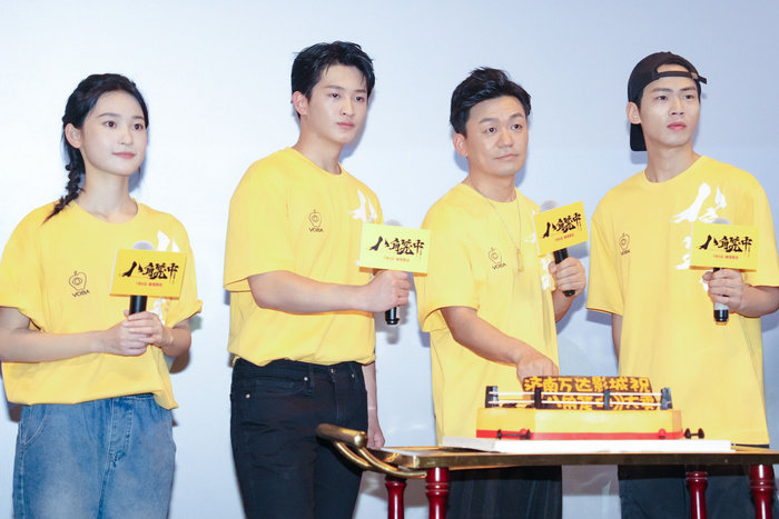 (右起)《八角笼中》导演、领衔主演王宝强携主演陈永胜、史彭元、张祎曈现身济南站路演。