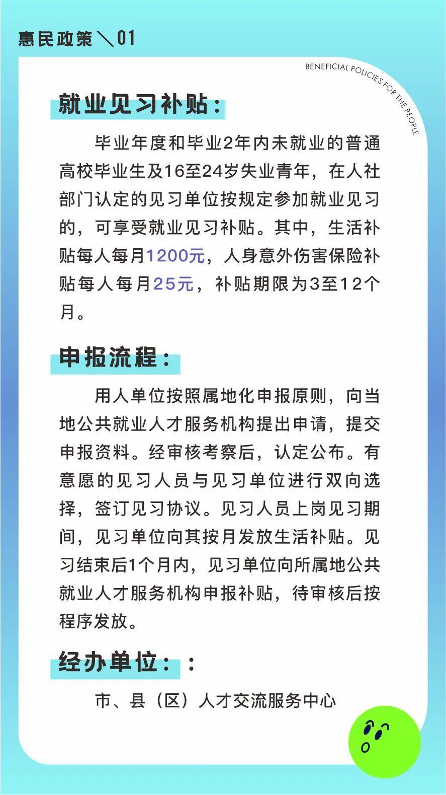 毕业年度(即从毕业当年1月1日起的12个月)和毕业两年内未就业的高校毕业生,包括专科及以上学历的统招毕业生,技师学院高级工班、预备技师班和特殊教育院校职业教育类毕业生,以及16至24岁失业青年,可向公共就业人才服务机构申请参加3至12个月的就业见习活动,见习期间享受政府提供的见习补贴,包括生活补贴和人身意外伤害保险补贴。