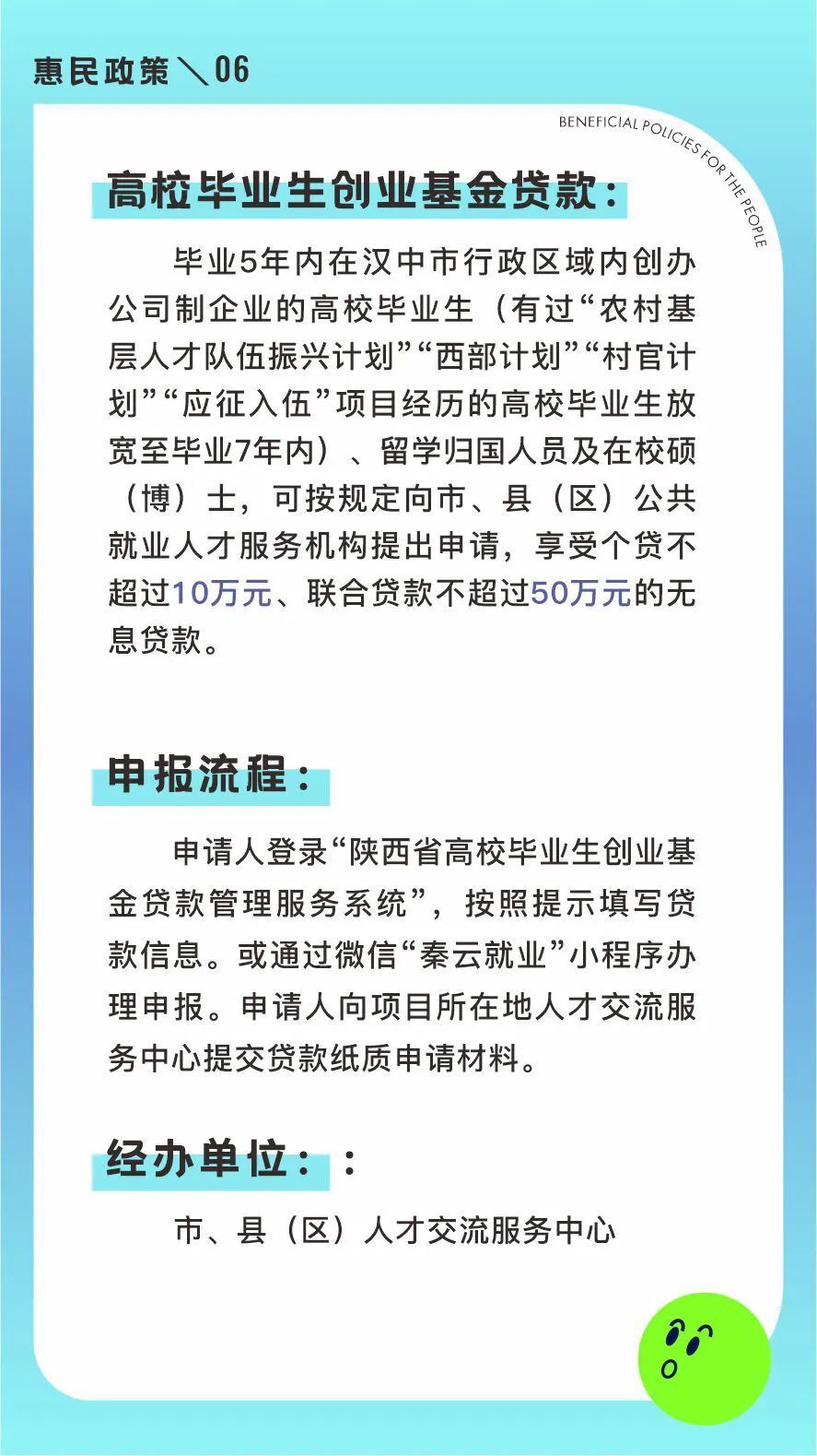 毕业5年内在汉中市行政区域内创办公司制企业的高校毕业生(有过“农村基层人才队伍振兴计划”“西部计划”“村官计划”“应征入伍”项目经历的高校毕业生放宽至毕业7年内)、留学归国人员及在校硕(博)士,可按规定向市、县(区)公共就业人才服务机构提出申请,享受个贷不超过10万元、联合贷款不超过50万元的无息贷款。