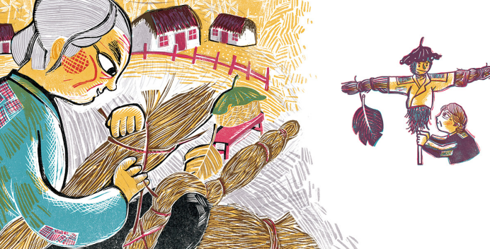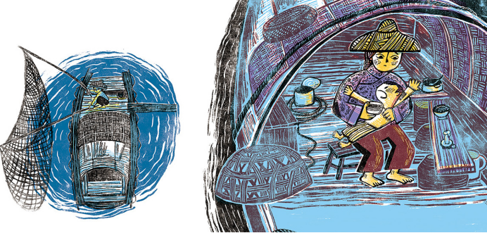 在描绘渔妇捕鱼时,作者还用拟人化的手法,把鲫鱼的想法展现出来——它很难过,想要逃出木桶,但以失败告终,它向稻草人求助。