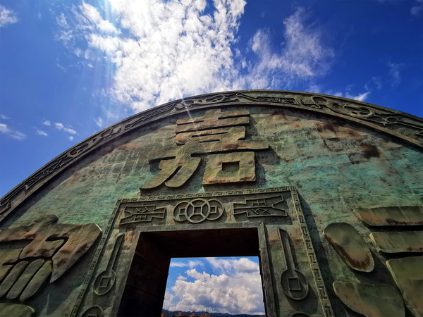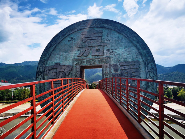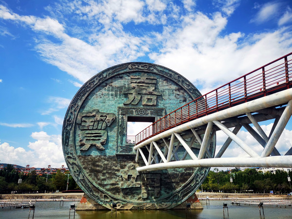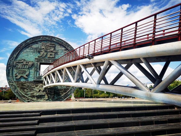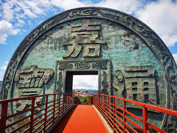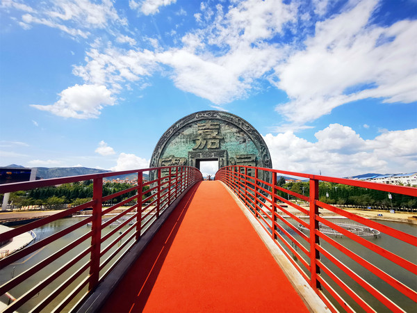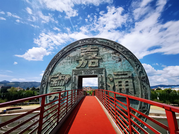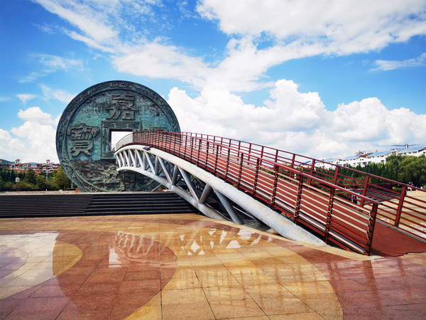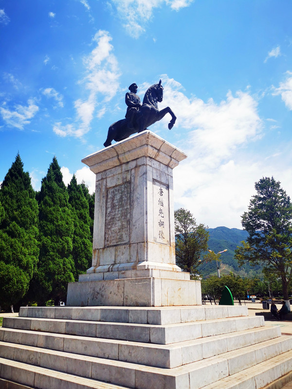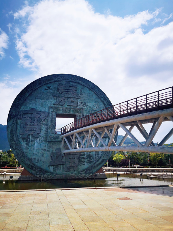 会泽历史悠久,在秦汉时为古夜郎地,清雍正五年置会泽县,至今已有两千多年的历史,1995年被列为云南省历史文化名城,隶属于曲靖市,它有一个响亮的名字——“钱王之乡”,古时会泽县因盛产铜矿,是清朝时期的“中央银行”,铜钱经由驻地各省会馆向全国流通,明代设有铸钱局,在这里开矿开炉采铜铸币,嘉靖年间更是铸出一枚重达41.7公斤的“嘉靖通宝”方孔圆钱,是嘉靖年间会泽铸币局铸造的开炉纪念币,是世界上最大、最重、最厚的金属古钱币,如今公园广场中轴线上的地标性建筑大铜钱便是仿“钱王”原型钱币放大39倍所建,直径为22.6米,重约8吨,是国际著名建筑设计大师谢秉漫教授创意设计,堪称又一世界之最,曾申报过吉尼斯世界纪录。一座流光溢彩的“彩虹桥”跨水而立,桥身轻盈通透,钱眼被一座斜桥贯穿飞越,成了人们“钻钱眼儿”的通道,它屹立于天地间,俯视古今,贯穿未来,象征会泽辉煌的铜业历史,等待来这里游玩的人们体验“钻钱眼”,从“钱眼”里走过是钻钱眼、沾财气的意思,代表着人们想要财源广进、幸福安康的心愿。穿过大铜钱孔,右边有一座塑像,只见一位将军骑着战马,手持宝剑,威风凛凛,这就是名震中外的唐继尧都督,他是滇军的创始者和领导人,出生于会泽,曾为云南的水利、交通、军事等作出很大贡献,如今会泽还有唐继尧的故居,免费对游人开放。