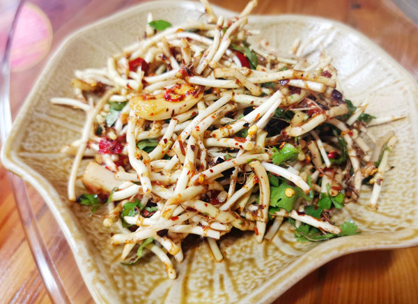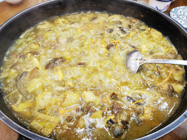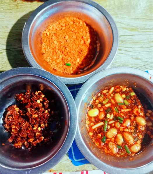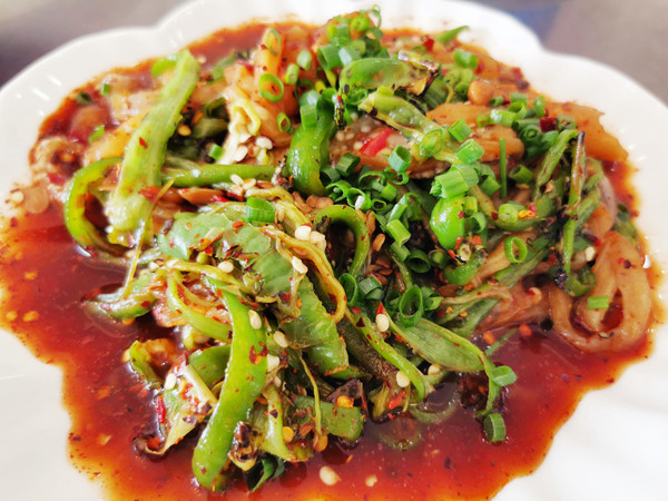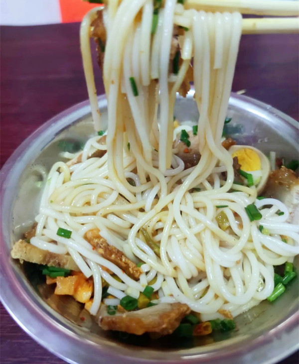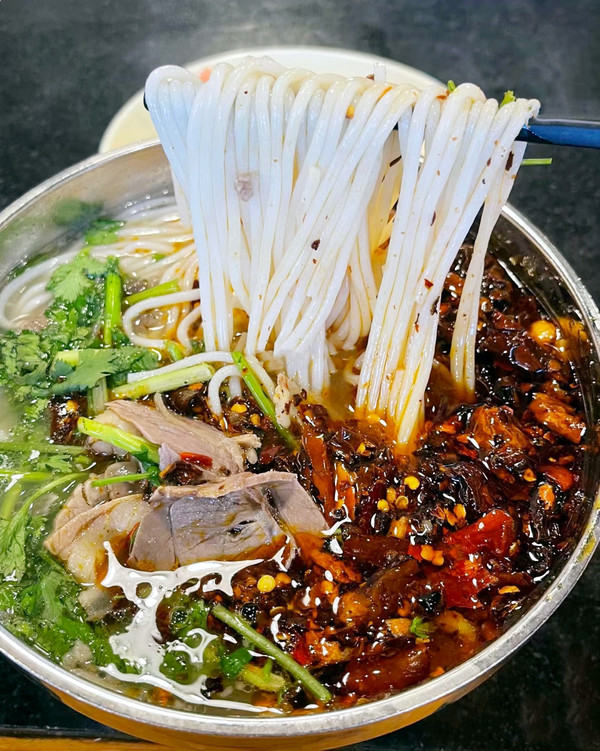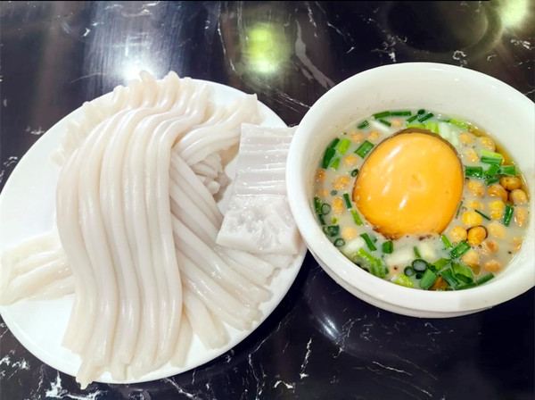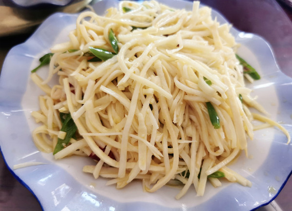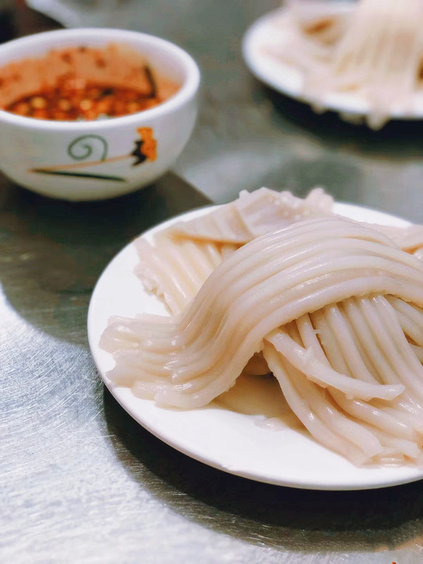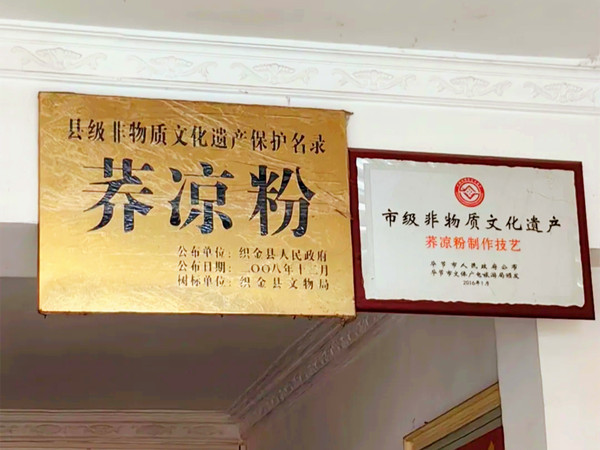 荞凉粉是织金的特色美食,辣香可口,生津止渴,清爽下火,是本地住户不可或缺的驱暑小吃,荞麦制成凉粉,用特制的刮子刮成长条装在盘里,凉粉口感有嚼劲,蘸水最特别,加了油酥的黄豆、特制的汤状豆腐乳、折耳根、蒜水等十多种原料,腐乳可以说是荞凉粉蘸水的“灵魂”,喜欢吃辣的朋友还可以加足辣椒面,辣椒面最好是生熟都有,另外再在蘸水里加个皮蛋,流心的皮蛋和腐乳汁才是绝配,凉凉的稠稠的,口感层次非常丰富,有一点点独特的臭味,喜欢的人应该非常喜欢,不喜欢的人应该一口就差不多了,为吃到最地道的荞凉粉,我和闺蜜还特意穿街走巷找到了巷弄深处的半边桥陈记荞凉粉去现场打包,这家居然还是市级非物质文化遗产,几十年一直坚守着传统手工的每一道工序,绝对是织金人味蕾上的乡愁记忆。