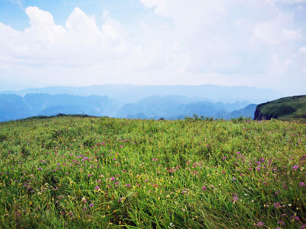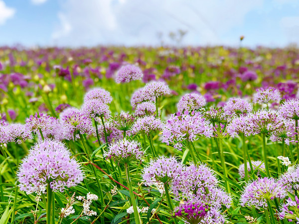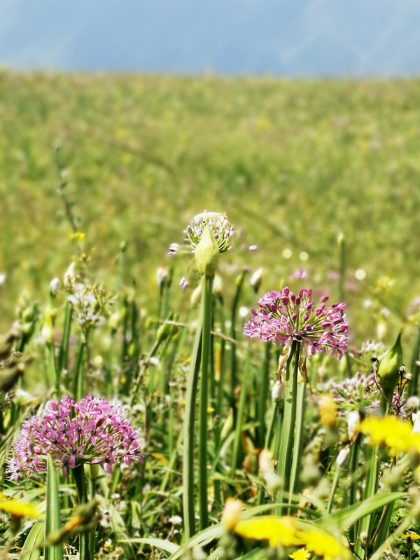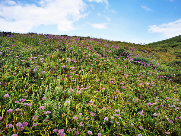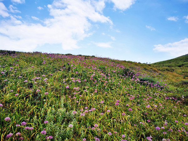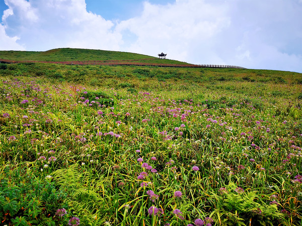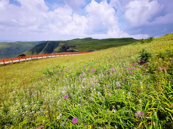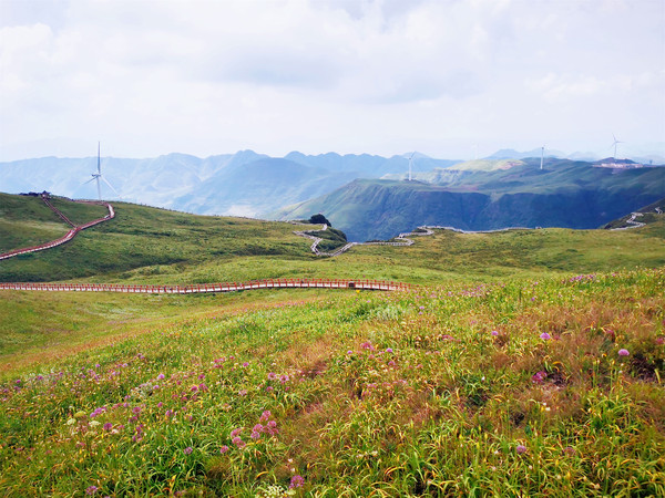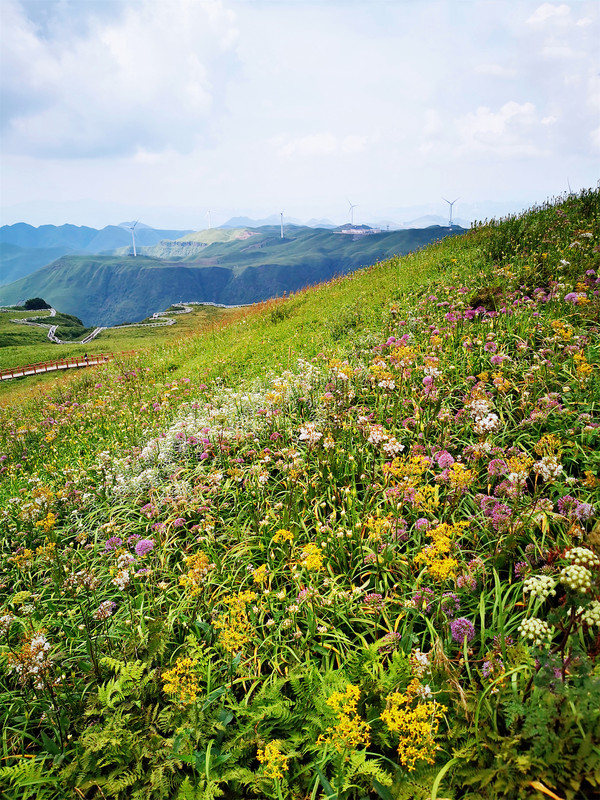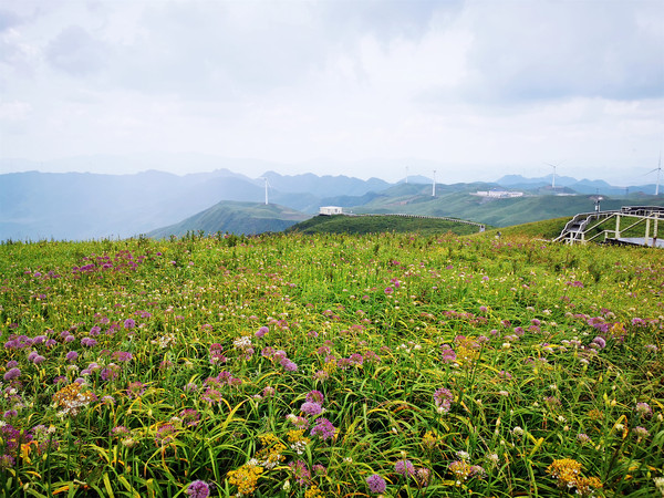 “不到韭菜坪,枉看贵州山。”在贵州乌蒙山一带,有两座相隔几十公里名为韭菜坪的高山,一座叫小韭菜坪,主峰海拔2900.6米,是贵州最高峰,有“贵州屋脊”之称,别名“天上石林”,一座叫大韭菜坪,位于毕节市赫章县,海拔2777米,也称阿西里西韭菜坪景区,阿西里西是彝族语言,意思是“大家一起来跳舞”。我们选择了离六盘水较近的阿西里西韭菜坪,去之前还担心会不会跟乌蒙大草原的景色太过雷同,结果却是意外的惊喜,东门进入索道上山巴士下山,乘坐缆车到达山顶,就发现了这里漫生着30万亩连片的天然野生韭菜花,野韭菜花形似蒲公英,比平常吃的韭菜花要漂亮得多,这种韭菜大概有60厘米高,具有极高的科学价值和美学欣赏价值,但却不可以食用,每年八九月正是韭菜花开的季节,漫山遍野的韭菜花竞相开放,芳香四溢,让人心旷神怡,淡紫或深紫的花朵,点缀在绿色草叶之间,不亚于薰衣草的美丽与清新,在山风的吹拂下婀娜多姿,犹如波浪般一浪跟着一浪随风而动,层层叠叠,向着远处绵延而去,漫山遍野的紫色球状韭菜花,将整个山峦幻化成一片紫色的海洋,紫得那样梦幻、那样迷离、那样妩媚,原来这里是世界上最大面积的野生韭菜花带、全国仅有的野生韭菜花保护区,中国野生韭菜-多星韭之乡,被赞誉为"地球的钻石",藏在深山中不为人知,山间还常年云雾缭绕,因此这片浩瀚的野生韭菜花海也被称为紫烟蒸腾的云上花海,这里不仅山高峰奇,植被也让人惊叹,常绿落叶林、针叶林、阔叶林、亚高山草丛、亚高山灌草丛等以不同的舞姿、造型随盘山路的盘旋而骤变,时而山花烂漫,时而绿树参天,山顶坪地更是芳草碧连天,峰顶修有观赏韭菜花的实木栈道,栈道在花海间弯曲伸展,仿佛一条矫健的巨龙在韭菜坪蜿蜒盘旋,远处是石头寨林立的风力发电站大风车,我们漫步在花海,四周异常清凉,栈道仿佛把我们一步步带向梦境。