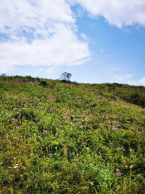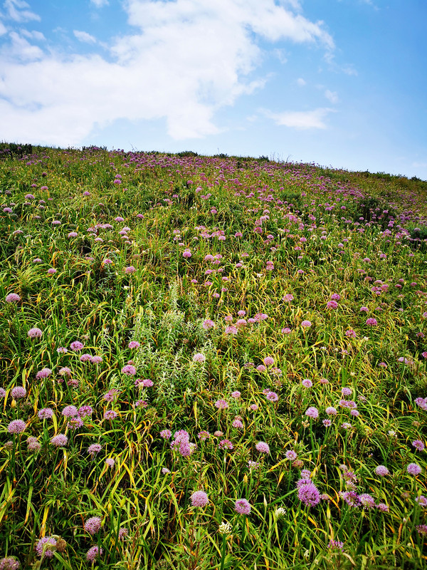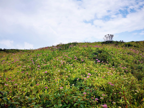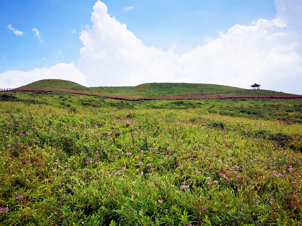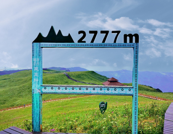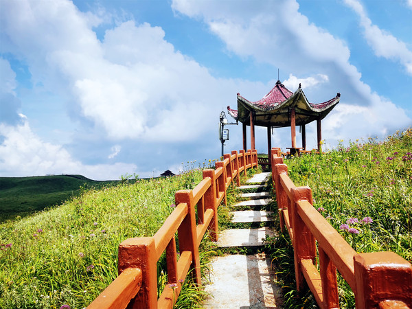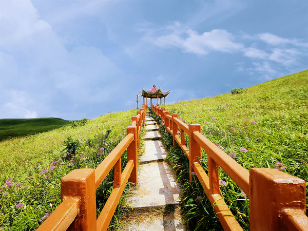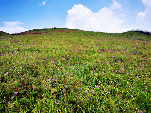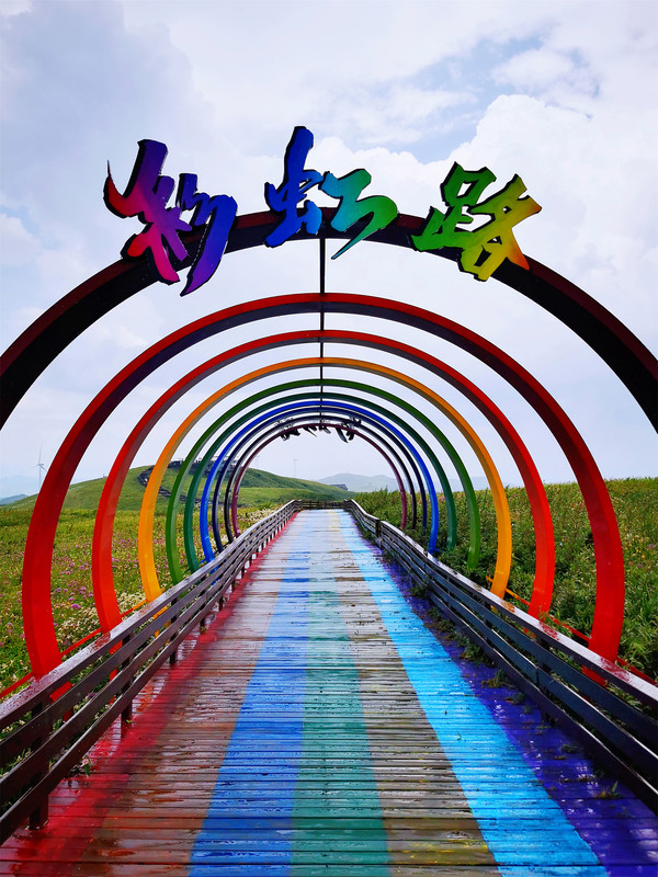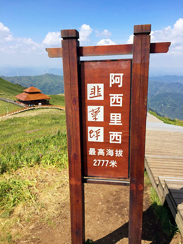 “不到韭菜坪,枉看贵州山。”在贵州乌蒙山一带,有两座相隔几十公里名为韭菜坪的高山,一座叫小韭菜坪,主峰海拔2900.6米,是贵州最高峰,有“贵州屋脊”之称,别名“天上石林”,一座叫大韭菜坪,位于毕节市赫章县,海拔2777米,也称阿西里西韭菜坪景区,阿西里西是彝族语言,意思是“大家一起来跳舞”。我们选择了离六盘水较近的阿西里西韭菜坪,去之前还担心会不会跟乌蒙大草原的景色太过雷同,结果却是意外的惊喜,东门进入索道上山巴士下山,乘坐缆车到达山顶,就发现了这里漫生着30万亩连片的天然野生韭菜花,野韭菜花形似蒲公英,比平常吃的韭菜花要漂亮得多,这种韭菜大概有60厘米高,具有极高的科学价值和美学欣赏价值,但却不可以食用,每年八九月正是韭菜花开的季节,漫山遍野的韭菜花竞相开放,芳香四溢,让人心旷神怡,淡紫或深紫的花朵,点缀在绿色草叶之间,不亚于薰衣草的美丽与清新,在山风的吹拂下婀娜多姿,犹如波浪般一浪跟着一浪随风而动,层层叠叠,向着远处绵延而去,漫山遍野的紫色球状韭菜花,将整个山峦幻化成一片紫色的海洋,紫得那样梦幻、那样迷离、那样妩媚,原来这里是世界上最大面积的野生韭菜花带、全国仅有的野生韭菜花保护区,中国野生韭菜-多星韭之乡,被赞誉为"地球的钻石",藏在深山中不为人知,山间还常年云雾缭绕,因此这片浩瀚的野生韭菜花海也被称为紫烟蒸腾的云上花海,这里不仅山高峰奇,植被也让人惊叹,常绿落叶林、针叶林、阔叶林、亚高山草丛、亚高山灌草丛等以不同的舞姿、造型随盘山路的盘旋而骤变,时而山花烂漫,时而绿树参天,山顶坪地更是芳草碧连天,峰顶修有观赏韭菜花的实木栈道,栈道在花海间弯曲伸展,仿佛一条矫健的巨龙在韭菜坪蜿蜒盘旋,远处是石头寨林立的风力发电站大风车,我们漫步在花海,四周异常清凉,栈道仿佛把我们一步步带向梦境。