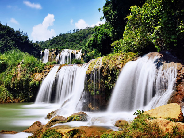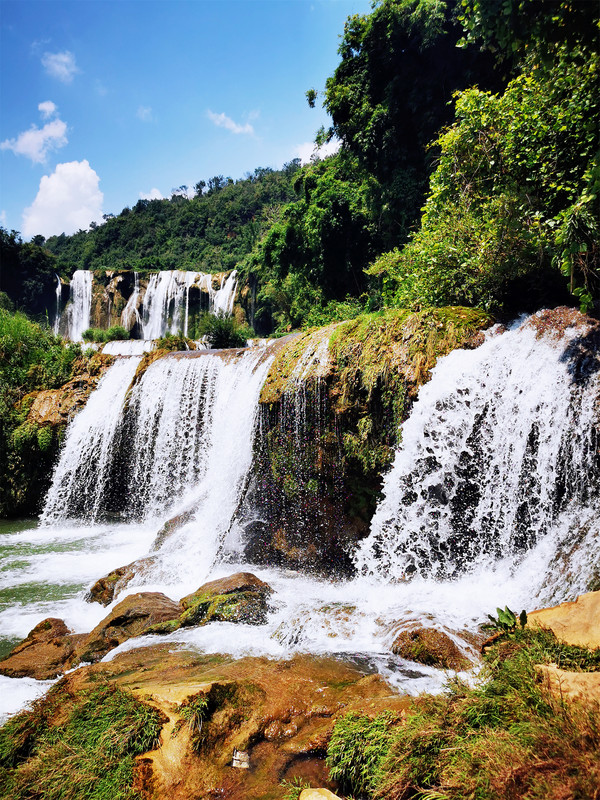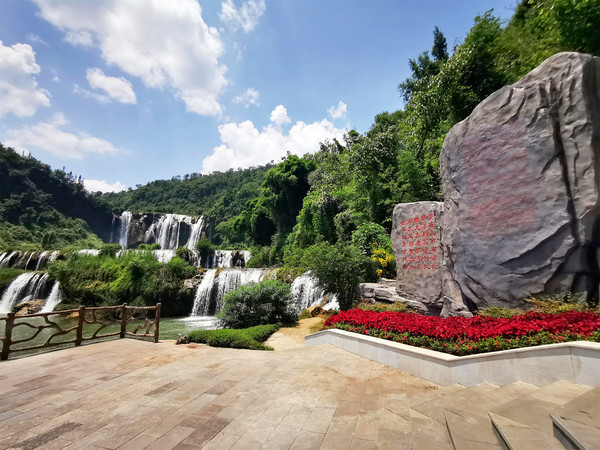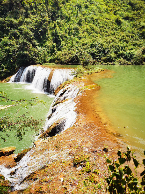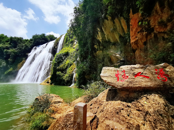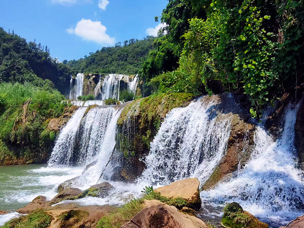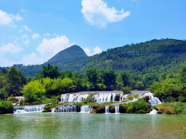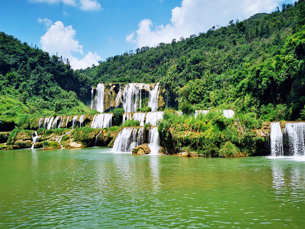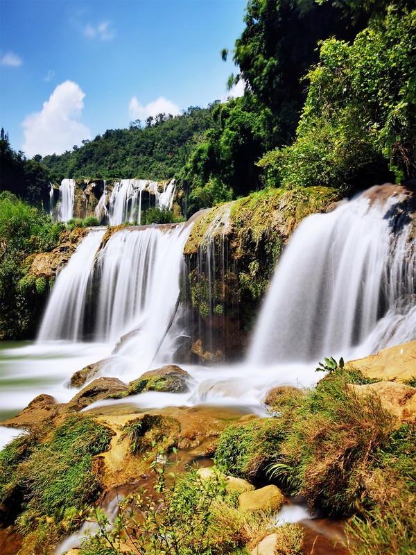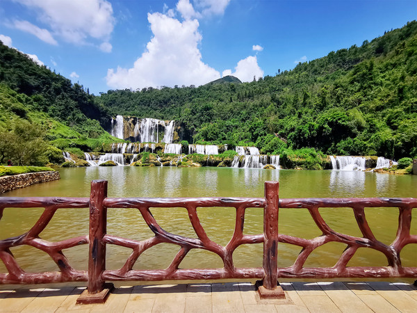 罗平九龙瀑布群,当地布依族人称其为“大叠水”,因特殊的地质构造和水流的千年侵蚀,形成了十级高低宽窄不等、形态各异的瀑布群,是九龙河上最具盛名的大瀑布群,在2005年《中国国家地理》“选美中国”活动中被评为“中国最美的六大瀑布”之一,有云南小黄果树之称,素有“九龙十瀑,南国一绝”的美誉。从东门进入,沿着蜿蜒的步道拾级而上,经过迎宾瀑、神龙瀑、石龙漫游瀑,最高可以走到情人瀑,大小瀑布高低错落有致,或雄伟、或险峻、或秀美、或舒缓,陡峭的悬崖峭壁上,水流波涛汹涌,从高山倾泻而下,浅滩深潭千姿百态,瀑间青藤缠绕,绿树郁葱,绿草镶嵌其中。我们随意行走于九龙瀑布群,呼吸着清新的空气,看远处崇山峻岭、近处飞瀑幽潭,曼妙的山色和水景交织辉映,其中神龙瀑袖飘千尺,人称“九龙第一瀑”,瀑高70余米,瀑宽120余米,巨大的水流奔涌而下,洒入碧绿色的水潭中,激起层层白浪,情人瀑浪漫温柔,两帘大小不一的瀑布相拥而下,犹如一对浪漫情人遥对相视,依依不舍,诠释了传说中一对布依青年男女优美动听的爱情故事。