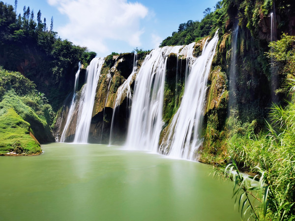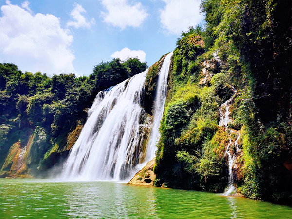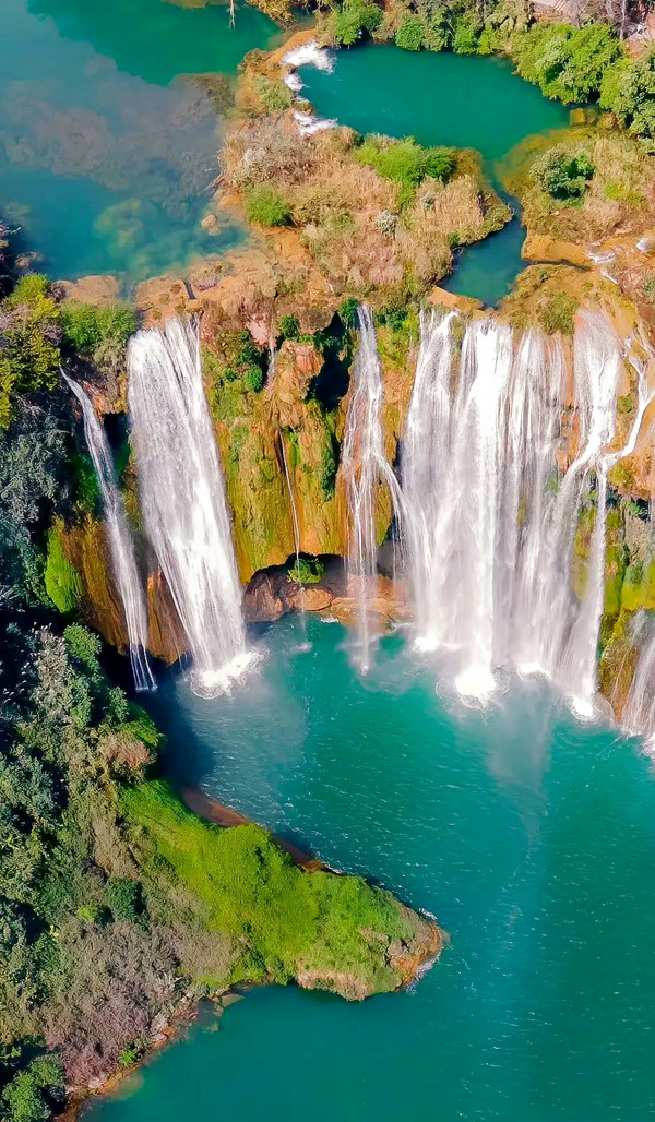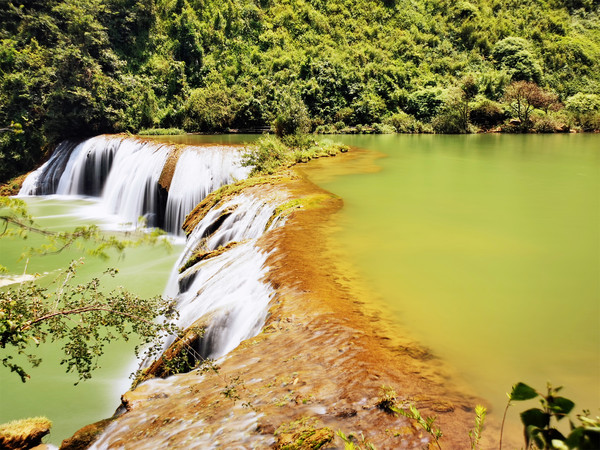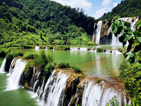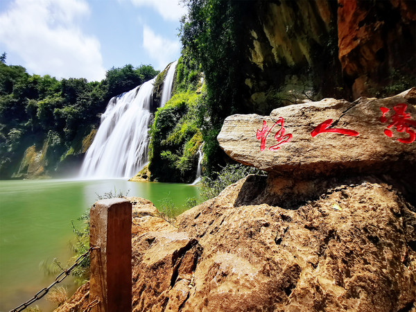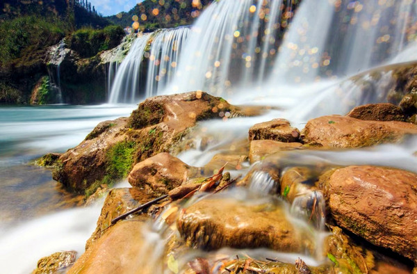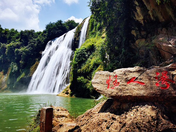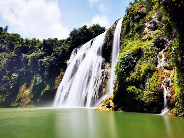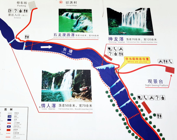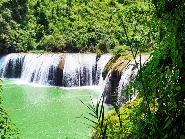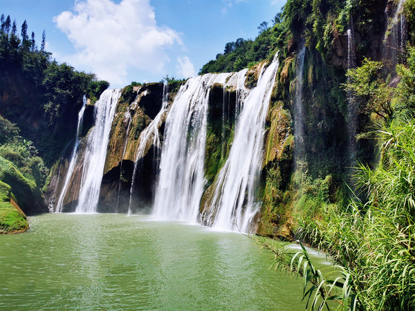 罗平九龙瀑布群,当地布依族人称其为“大叠水”,因特殊的地质构造和水流的千年侵蚀,形成了十级高低宽窄不等、形态各异的瀑布群,是九龙河上最具盛名的大瀑布群,在2005年《中国国家地理》“选美中国”活动中被评为“中国最美的六大瀑布”之一,有云南小黄果树之称,素有“九龙十瀑,南国一绝”的美誉。从东门进入,沿着蜿蜒的步道拾级而上,经过迎宾瀑、神龙瀑、石龙漫游瀑,最高可以走到情人瀑,大小瀑布高低错落有致,或雄伟、或险峻、或秀美、或舒缓,陡峭的悬崖峭壁上,水流波涛汹涌,从高山倾泻而下,浅滩深潭千姿百态,瀑间青藤缠绕,绿树郁葱,绿草镶嵌其中。我们随意行走于九龙瀑布群,呼吸着清新的空气,看远处崇山峻岭、近处飞瀑幽潭,曼妙的山色和水景交织辉映,其中神龙瀑袖飘千尺,人称“九龙第一瀑”,瀑高70余米,瀑宽120余米,巨大的水流奔涌而下,洒入碧绿色的水潭中,激起层层白浪,情人瀑浪漫温柔,两帘大小不一的瀑布相拥而下,犹如一对浪漫情人遥对相视,依依不舍,诠释了传说中一对布依青年男女优美动听的爱情故事。
